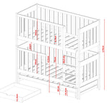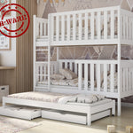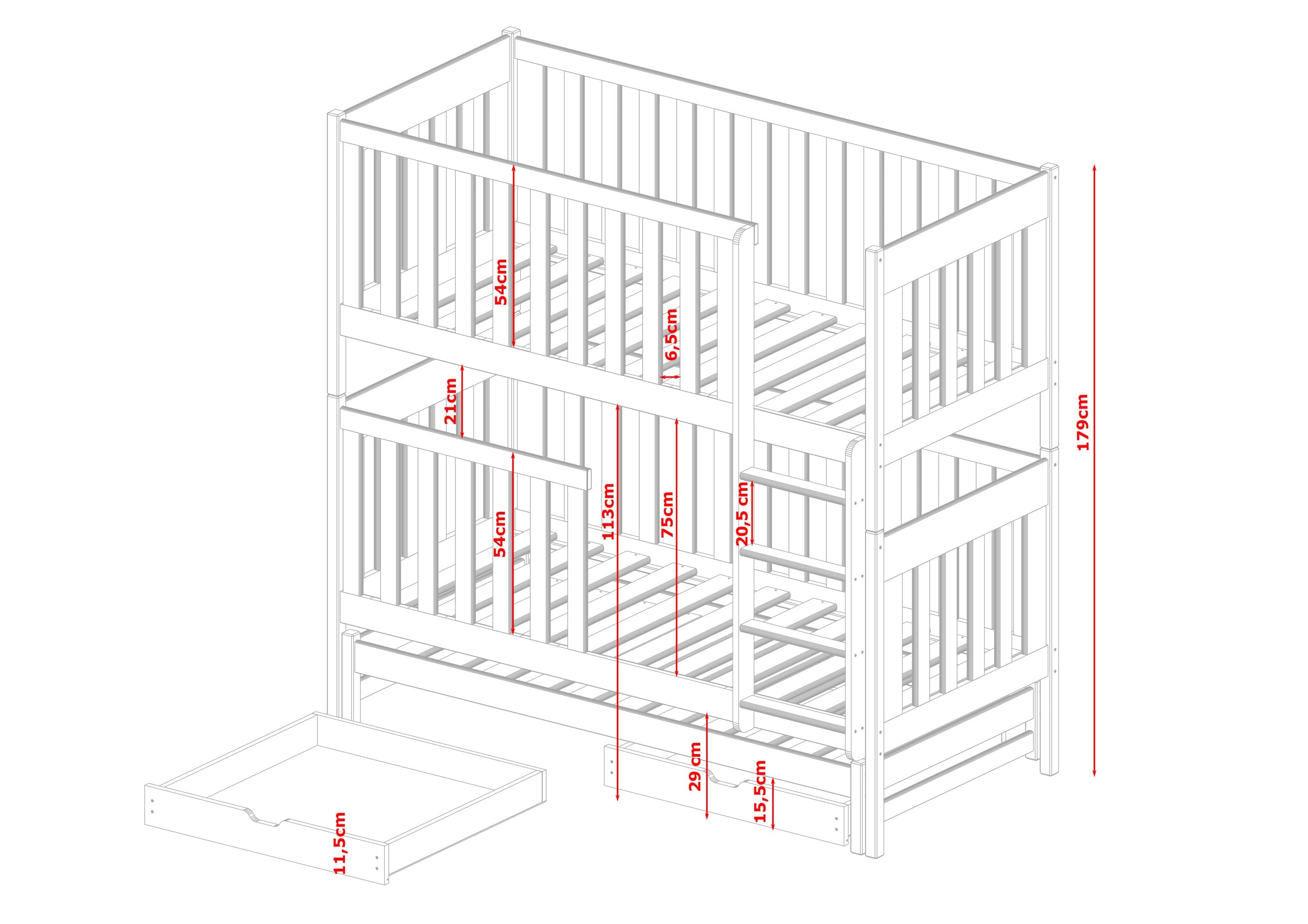 Das Bett besteht aus FSC-Kiefer-Vollholz und ist nach den höchsten Sicherheitsnormen zertifiziert. Die wasserbasierten, kinderfreundlichen Farben sind geruchslos, leck- und speichelfest und bieten maximale Sicherheit für Ihr Kind. Die Schublade ist aus MDF. Jede Liegefläche kann mit bis zu 100 kg belastet werden.