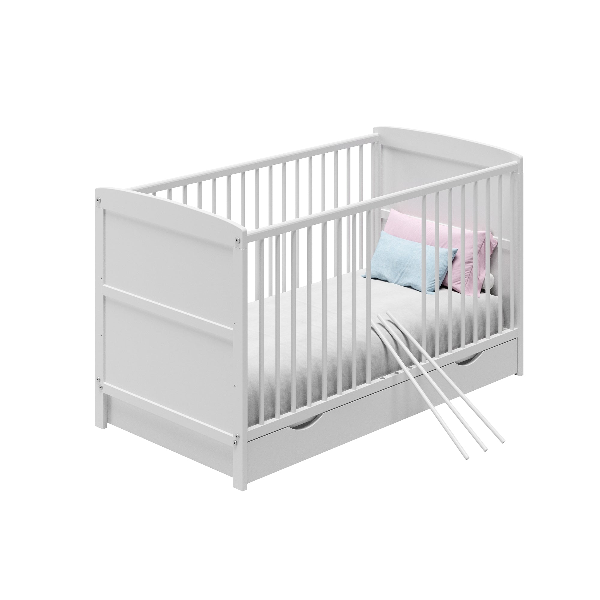 Besonders praktisch ist die integrierte Schublade unter dem Bett, die reichlich Stauraum für Bettwäsche, Kleidung, Spielzeug oder andere Babyutensilien bietet und somit für mehr Ordnung im Kinderzimmer sorgt. Das Bett lässt sich außerdem in der Höhe verstellen und später zu einem Kleinkindbett umbauen – so begleitet es Ihr Kind über mehrere Jahre hinweg und passt sich seinen wachsenden Bedürfnissen flexibel an.