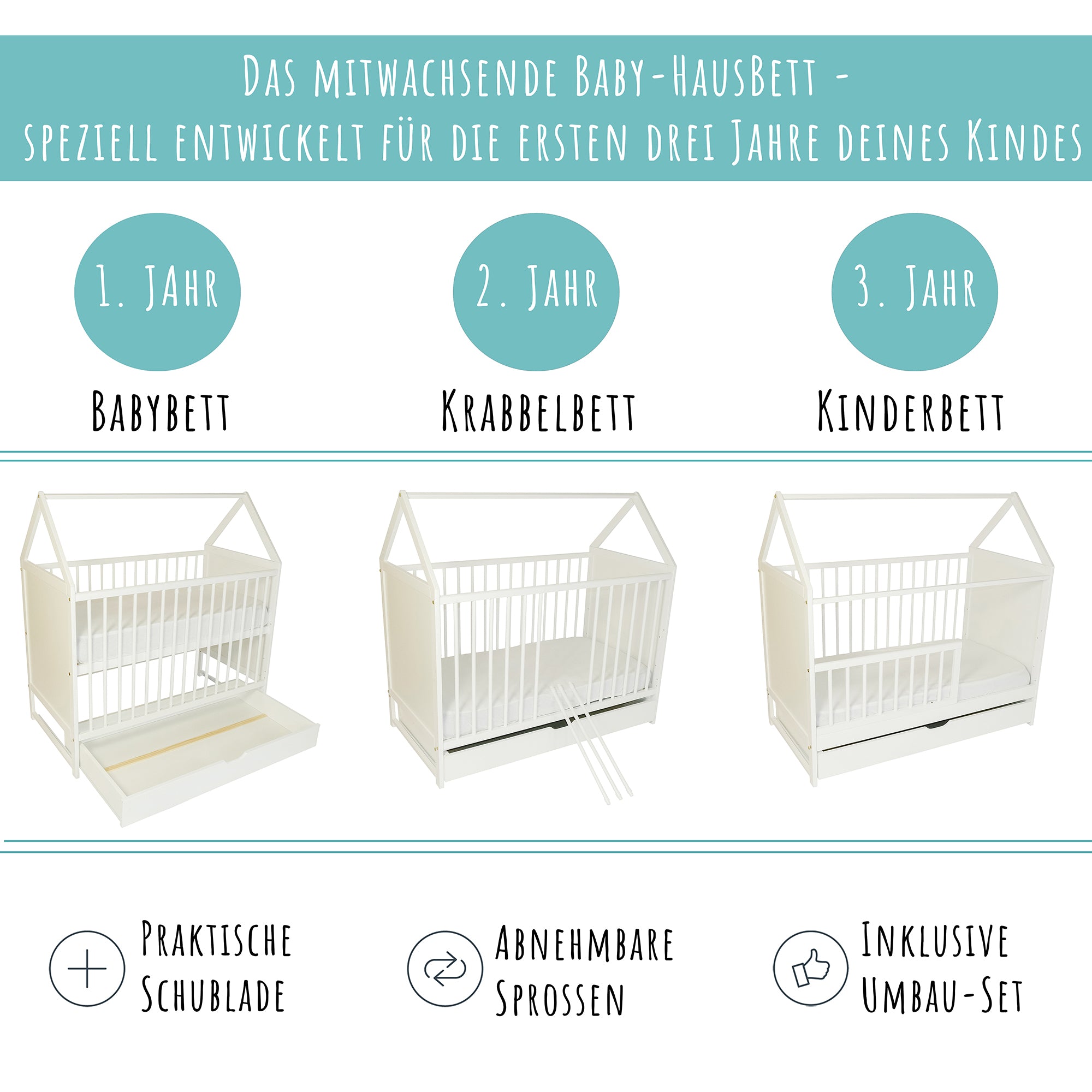 4-in-1: Baby-, Kinder-, Hausbett & mehr | Höhenverstellbar | 120 × 60 cm