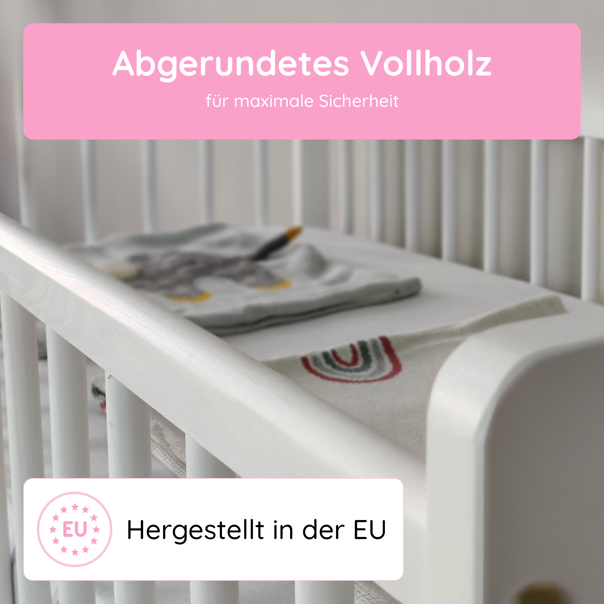Dieses Babybett im Maß 60×120 cm kombiniert kindgerechte Sicherheit mit funktionalem Design – ideal für die ersten Lebensjahre. Es wird in einem europäischen Familienbetrieb aus massivem Kiefernholz gefertigt und erfüllt alle gängigen EU-Sicherheitsnormen. Die schadstofffreie Lackierung auf Wasserbasis sorgt für eine unbedenkliche Umgebung ab dem ersten Tag – perfekt für gesundes Schlafen und sorgenfreies Aufwachsen.