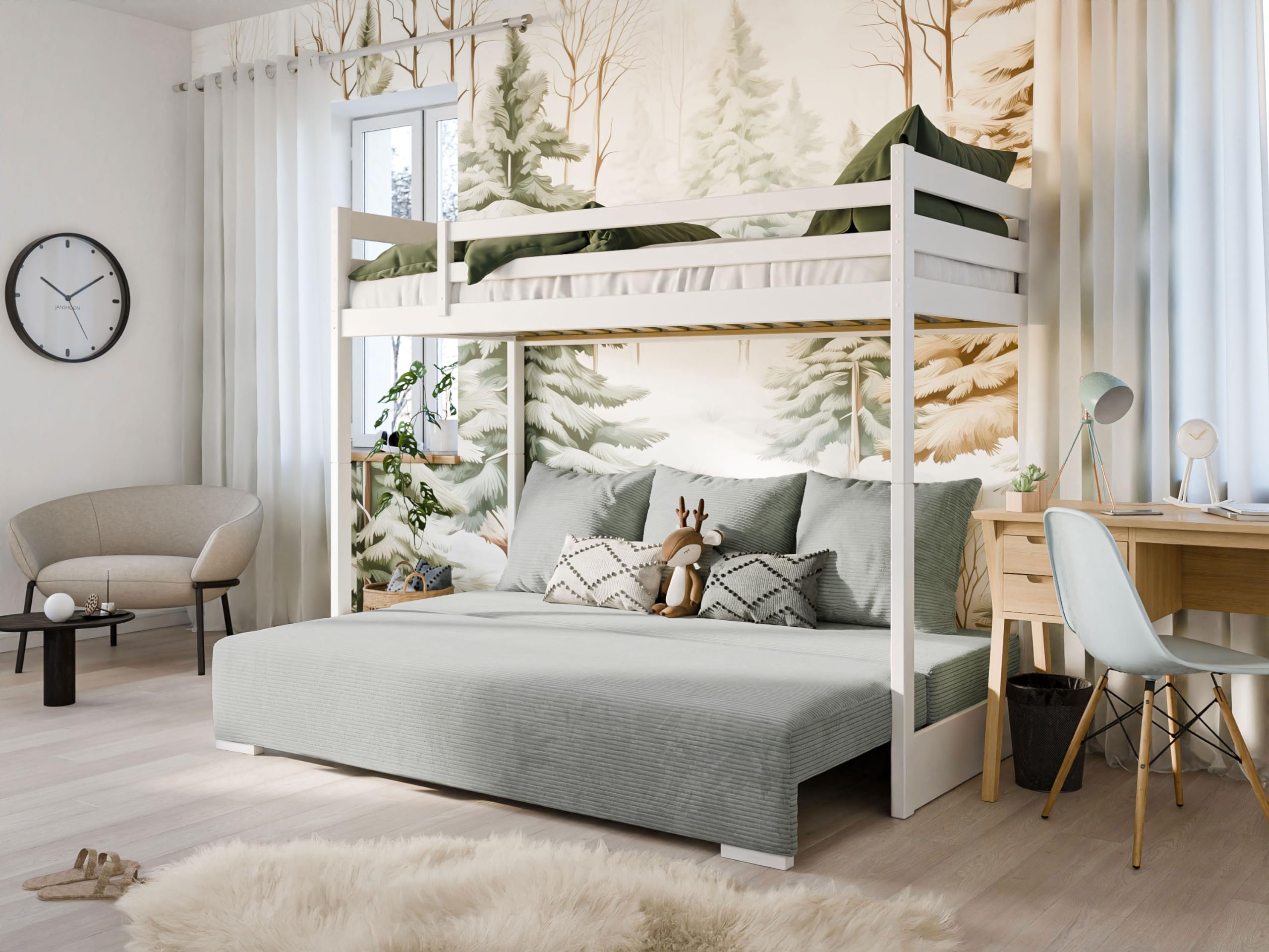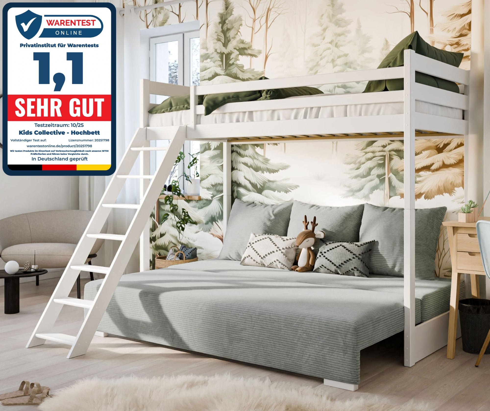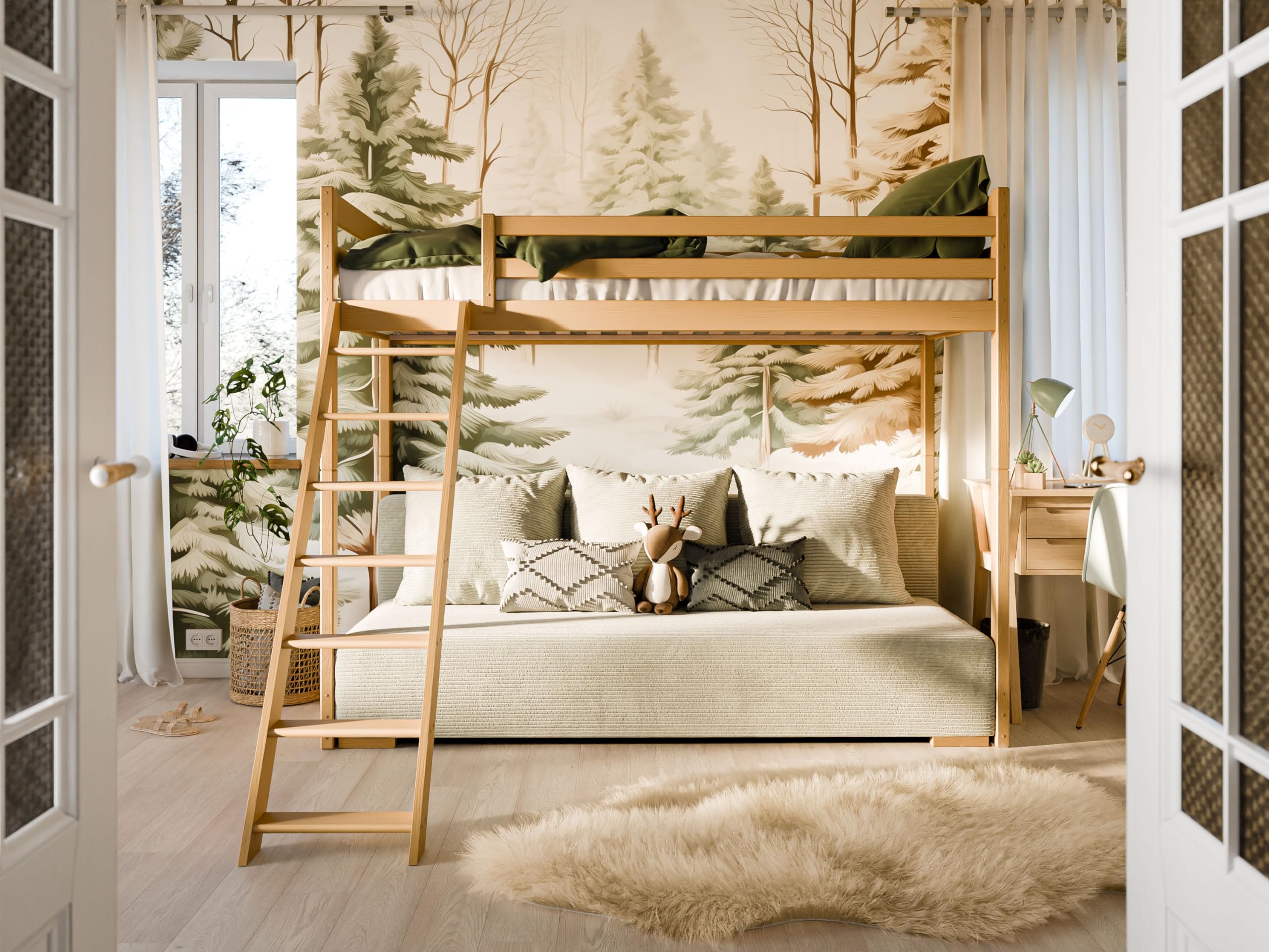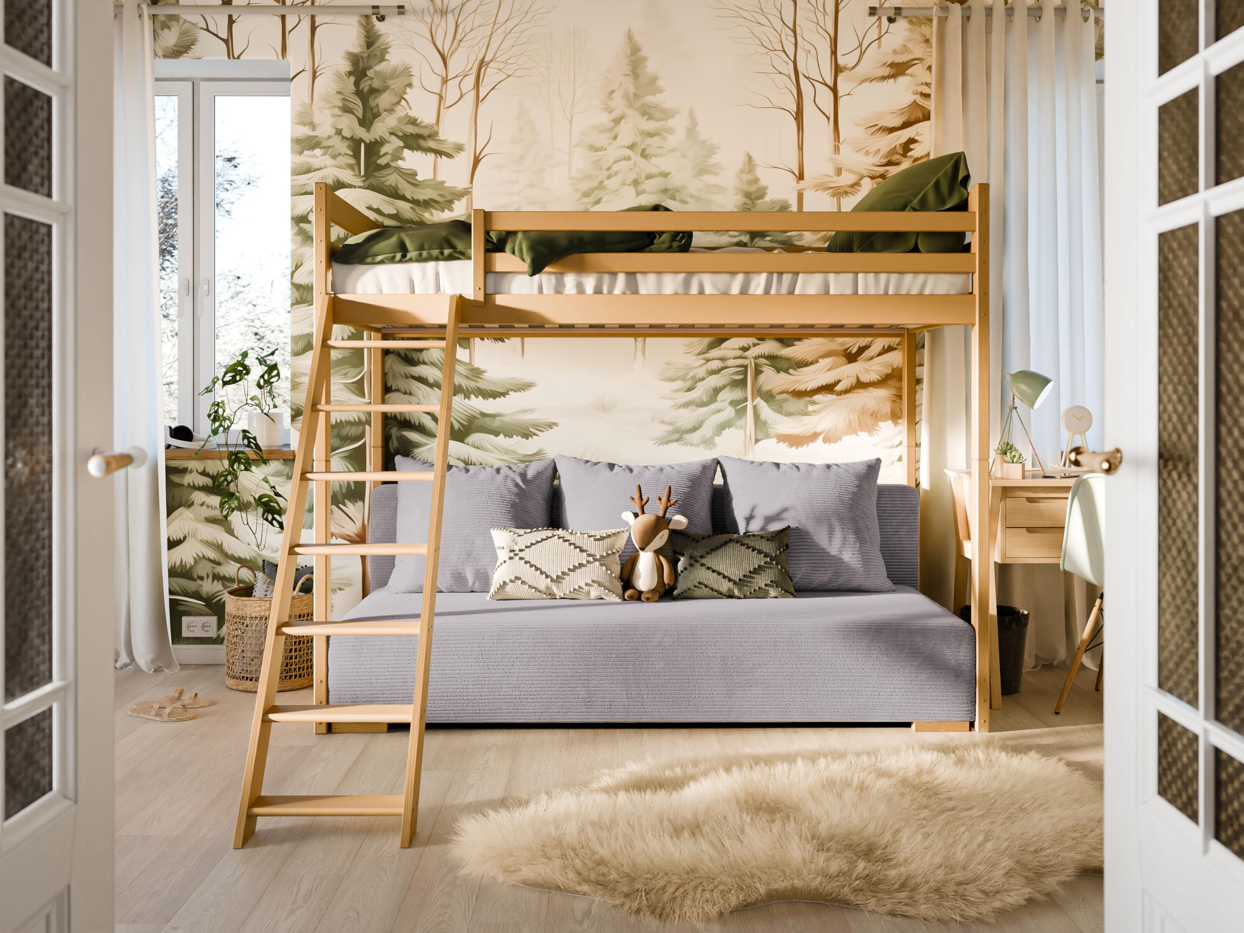 Dieses innovative Hochbett kombiniert gemütliche Sitzgelegenheit und komfortablen Schlafplatz in einem durchdachten Möbelstück. Tagsüber lädt das klappbare Sofa zum Lesen, Spielen oder Entspannen ein, abends verwandelt es sich dank Wellenunterfederung und T42-Komfortschaum in ein vollwertiges Doppelbett – perfekt für Übernachtungsgäste oder Geschwister.