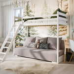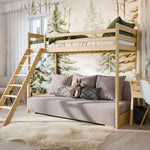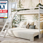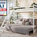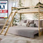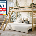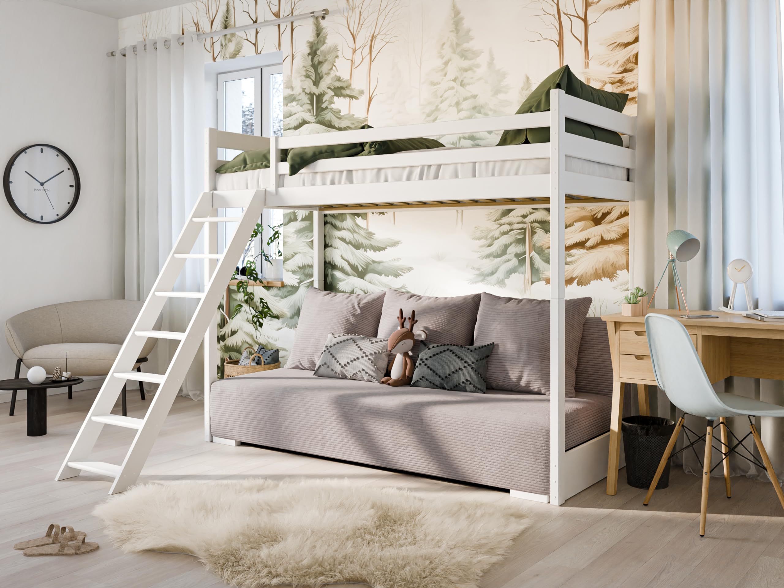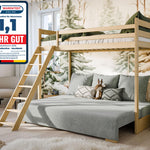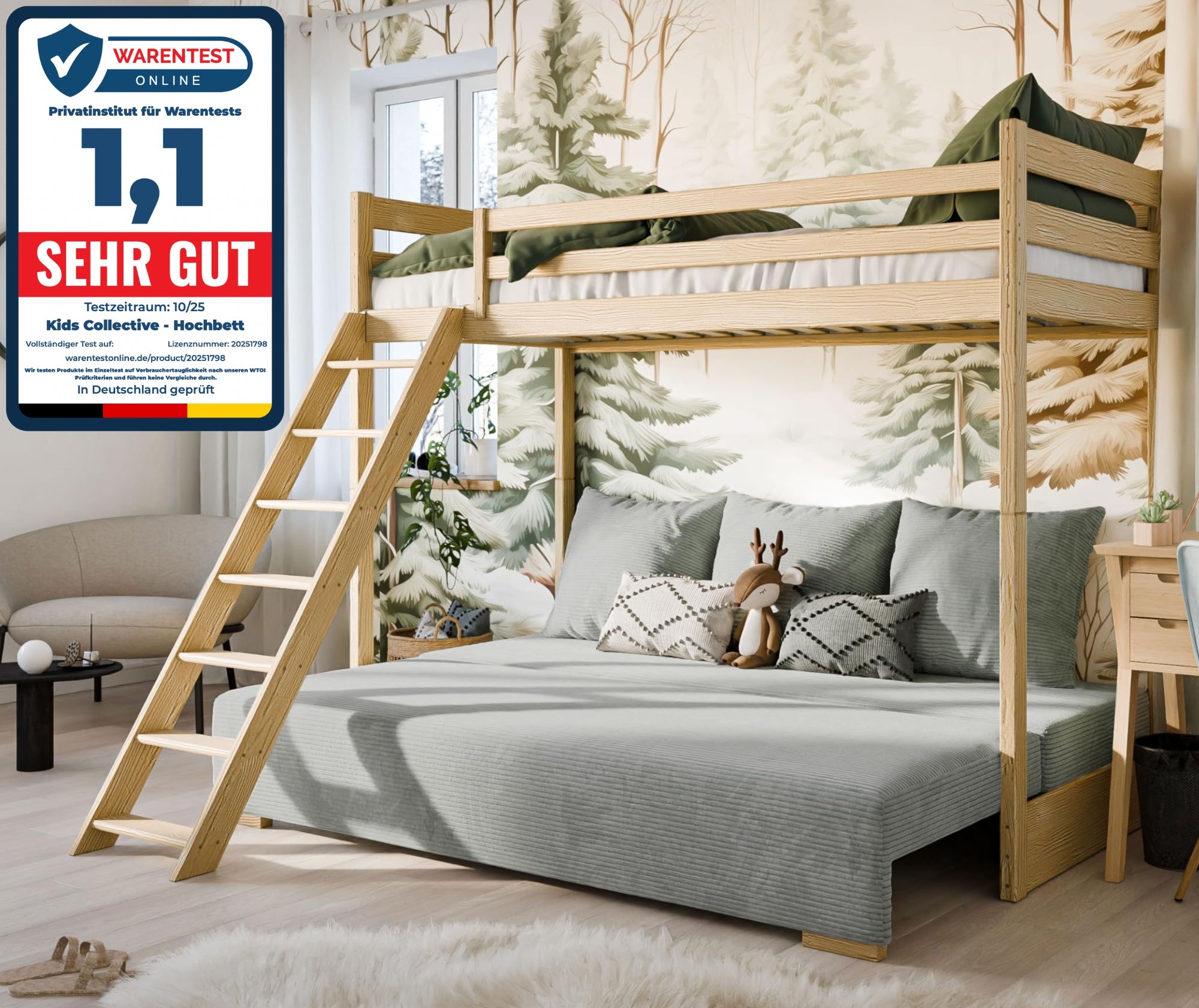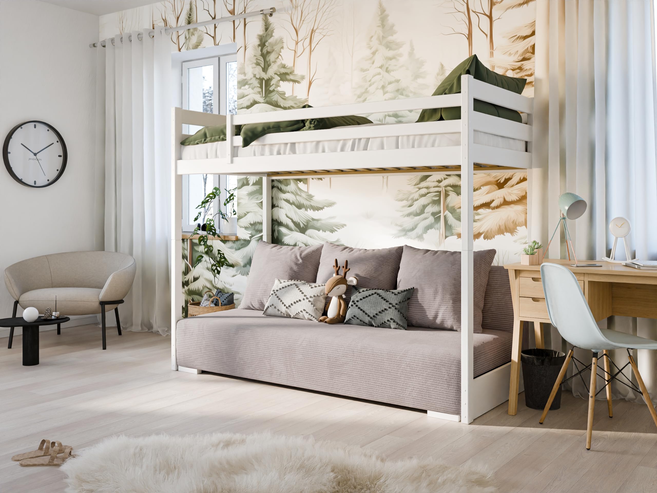 Dieses innovative Hochbett kombiniert gemütliche Sitzgelegenheit und komfortablen Schlafplatz in einem durchdachten Möbelstück. Tagsüber lädt das klappbare Sofa zum Lesen, Spielen oder Entspannen ein, abends verwandelt es sich dank Wellenunterfederung und T42-Komfortschaum in ein vollwertiges Doppelbett – perfekt für Übernachtungsgäste oder Geschwister.