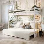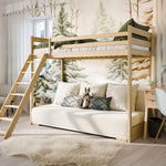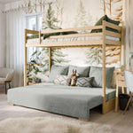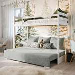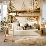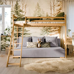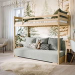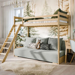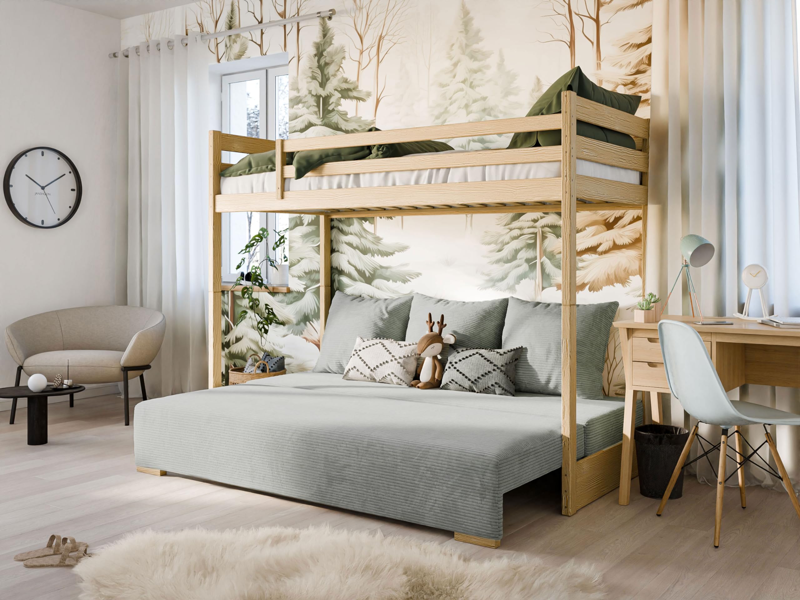 Dank zurückhaltendem Design fügt sich das Etagenbett harmonisch in Wohnzimmer oder Kinderzimmer ein und schafft unter der Liegefläche zusätzlichen Raum für Spielzeugkisten, Schreibtisch oder Leseecke. Der OEKO-TEX-zertifizierte Bezug ist abriebfest und leicht zu reinigen – ideal für den lebhaften Familienalltag.