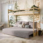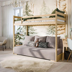 Im eingeklappten Zustand misst der Rahmen platzsparende 96 x 208 x 168 cm (BxTxH). Wird das Sofa ausgezogen, wächst die Breite auf 191 x 208 x 168 cm, ohne zusätzlichen Bodenplatz zu beanspruchen. Das stabile Gestell aus FSC-zertifiziertem Kiefernholz erhält durch eine halbmatte Lackierung nicht nur Schutz vor Kratzern, sondern betont auch die natürliche Maserung.