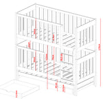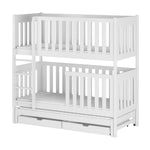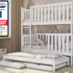 Das Bett besteht aus FSC-Kiefer-Vollholz und ist nach den höchsten Sicherheitsnormen zertifiziert. Die wasserbasierten, kinderfreundlichen Farben sind geruchslos, leck- und speichelfest und bieten maximale Sicherheit für Ihr Kind. Die Schublade ist aus MDF. Jede Liegefläche kann mit bis zu 100 kg belastet werden.
