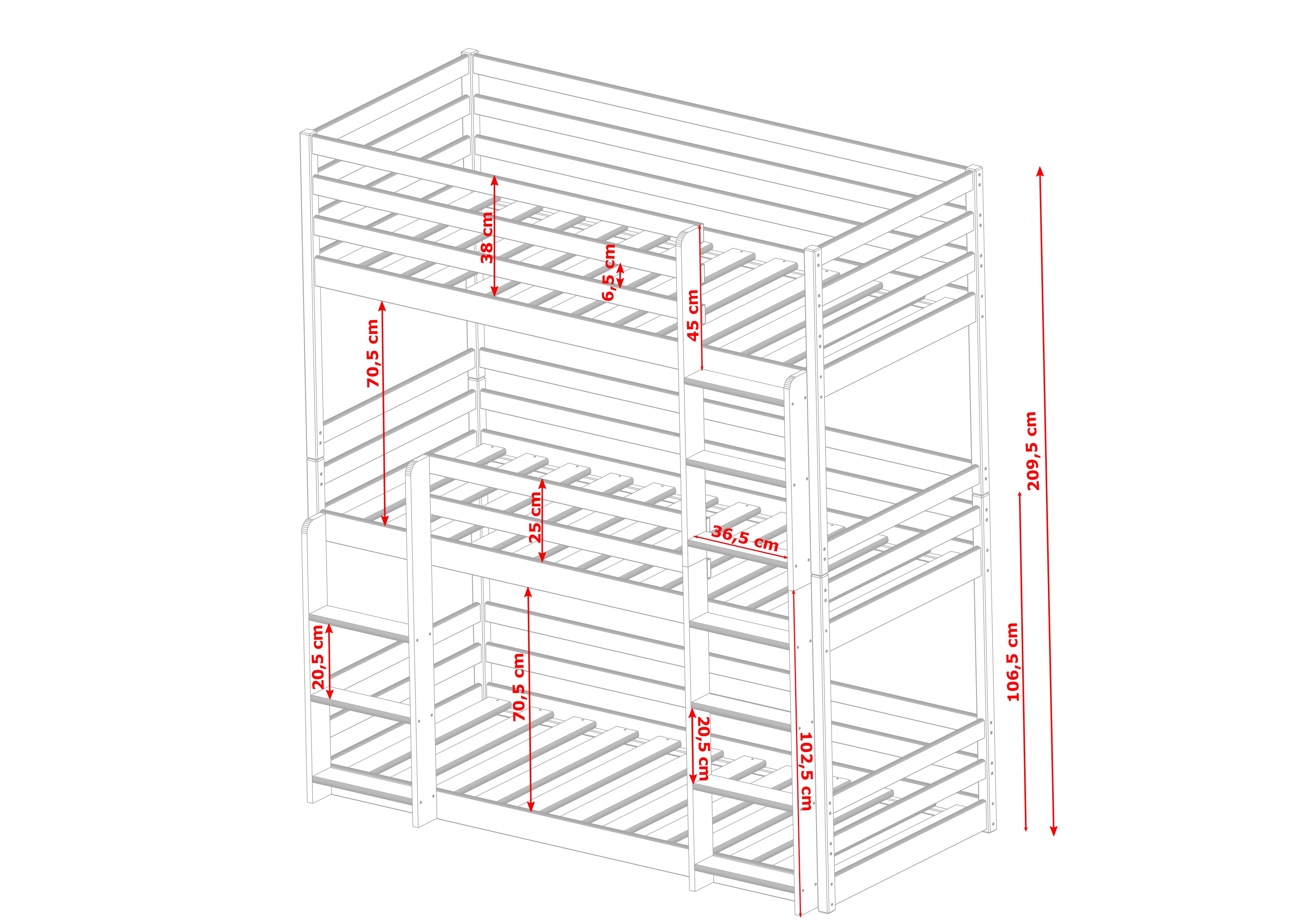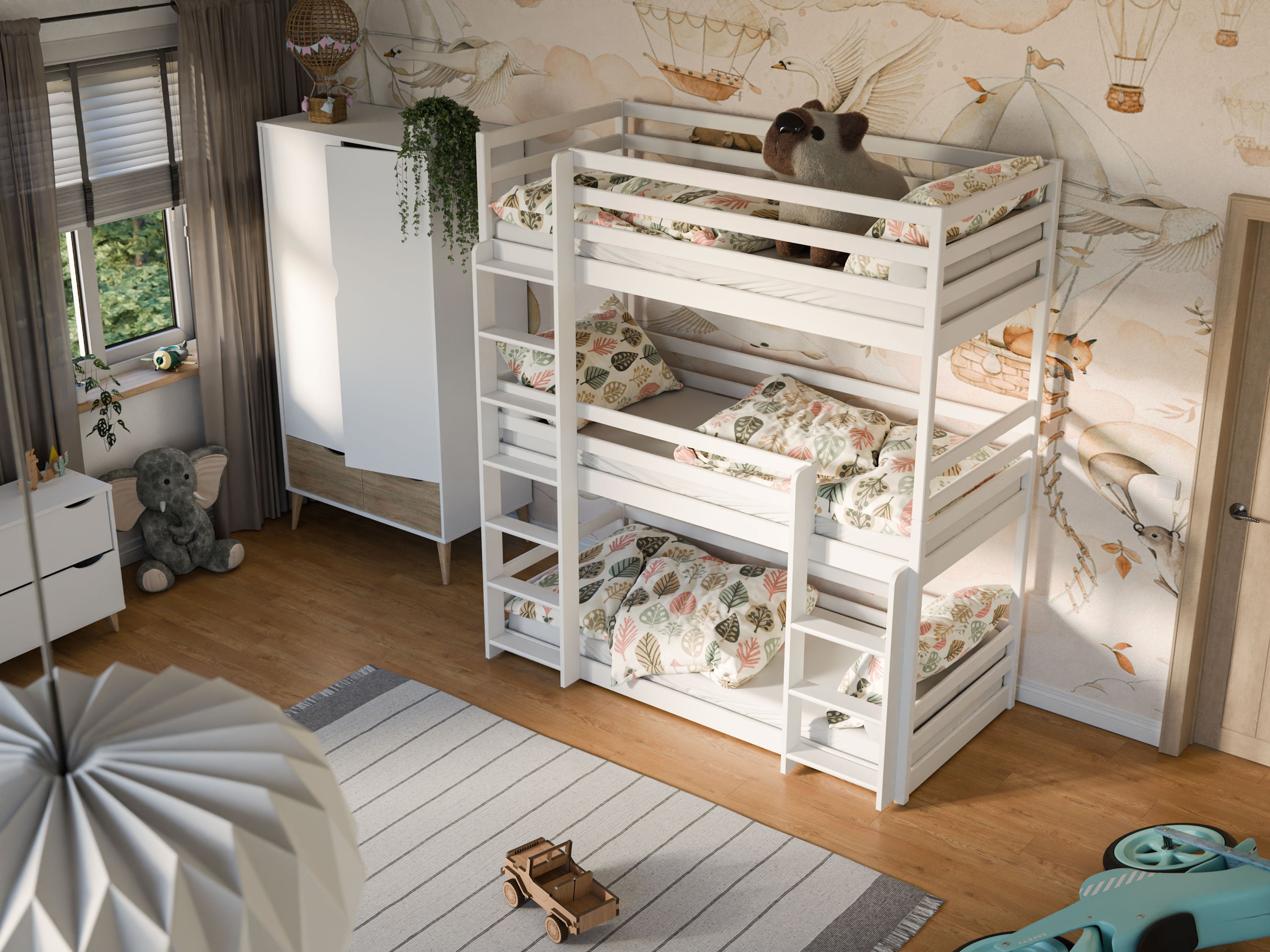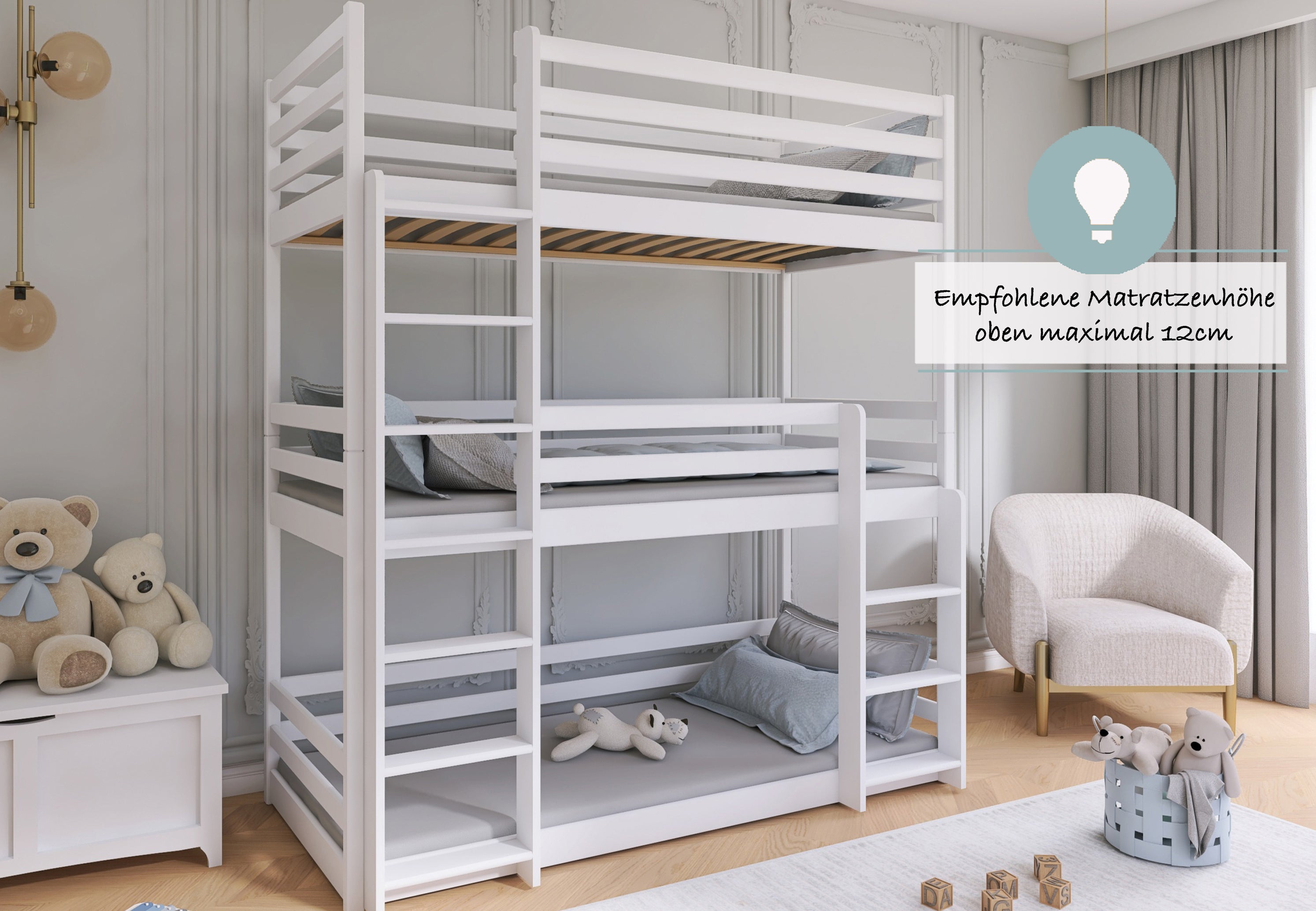 Dreier-Etagenbett | Optional 3 Matratzen | 3 × Lattenrost | Vollholz massiv | 90 × 200 cm