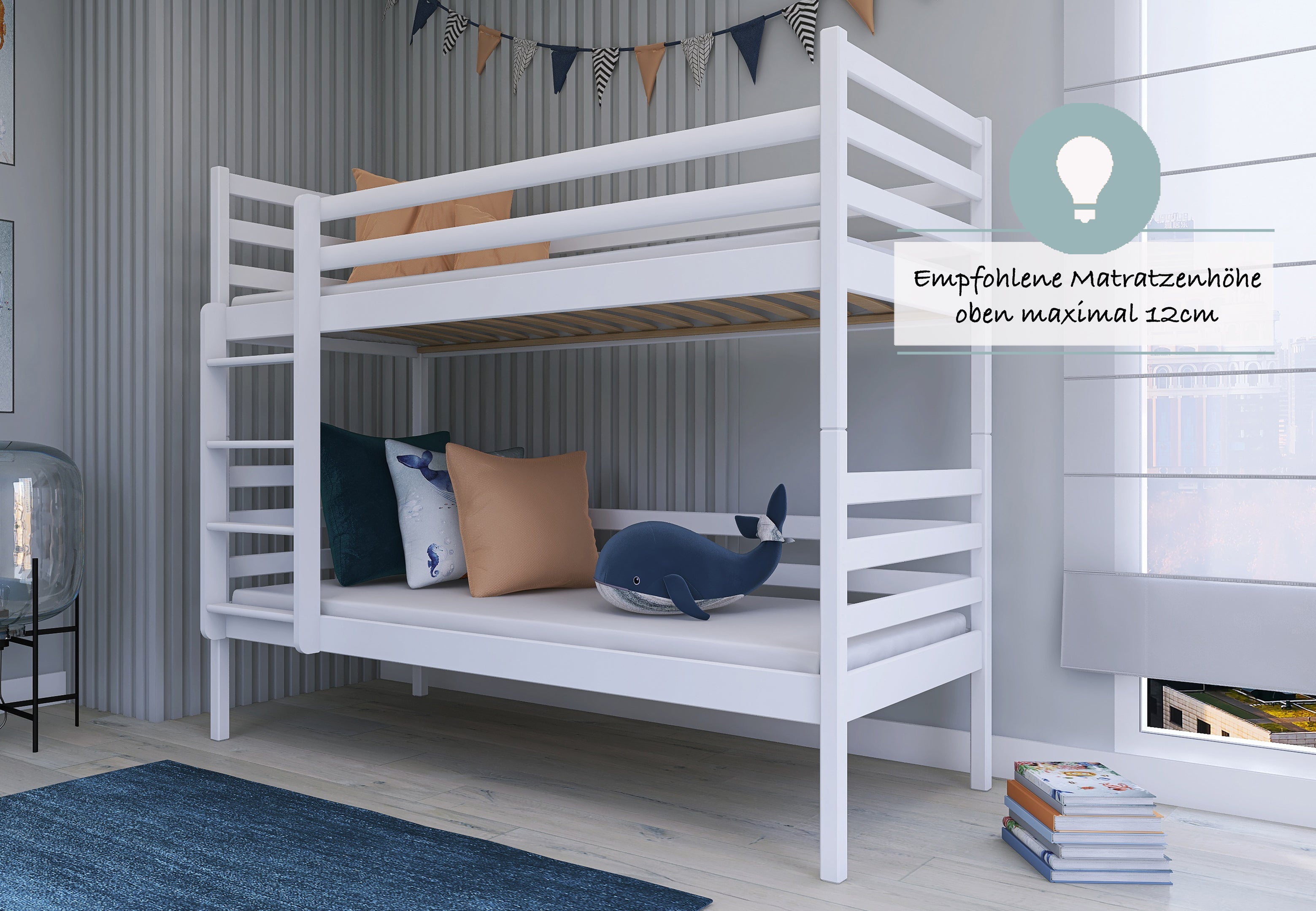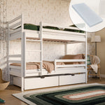 Hochbett 90x200 cm mit 2 Matratzen (optional) und 2 Schubladen (optional) Etagenbett mit Rausfallschutz und Lattenrost, umbaubar in zwei Kinderbetten, aus Vollholz massiv in weiß, Funktionsbett