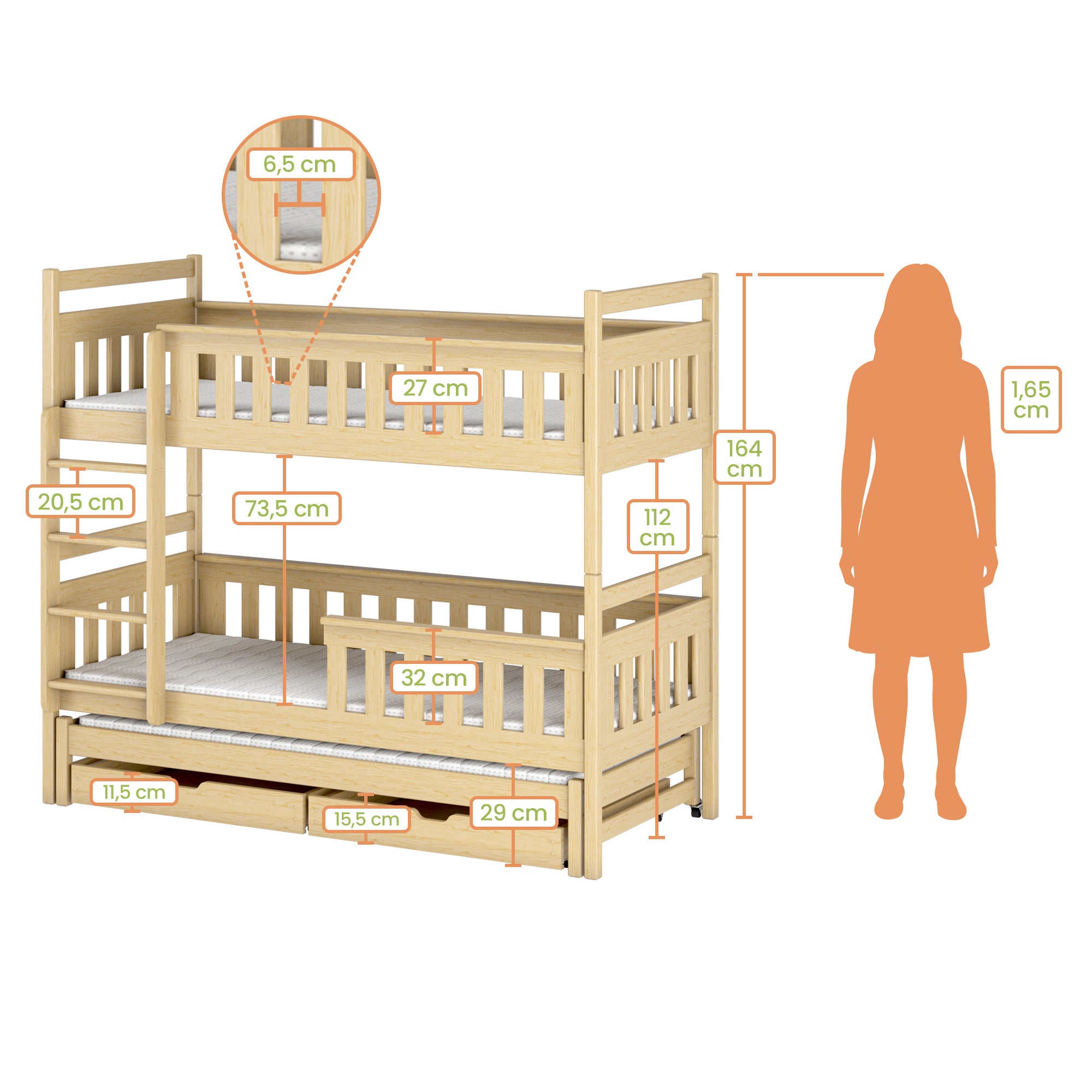 Ausziehbett & 2 Schubladen | Umbaubar in 3 Einzelbetten | Vollholz massiv | 90 × 200 cm
