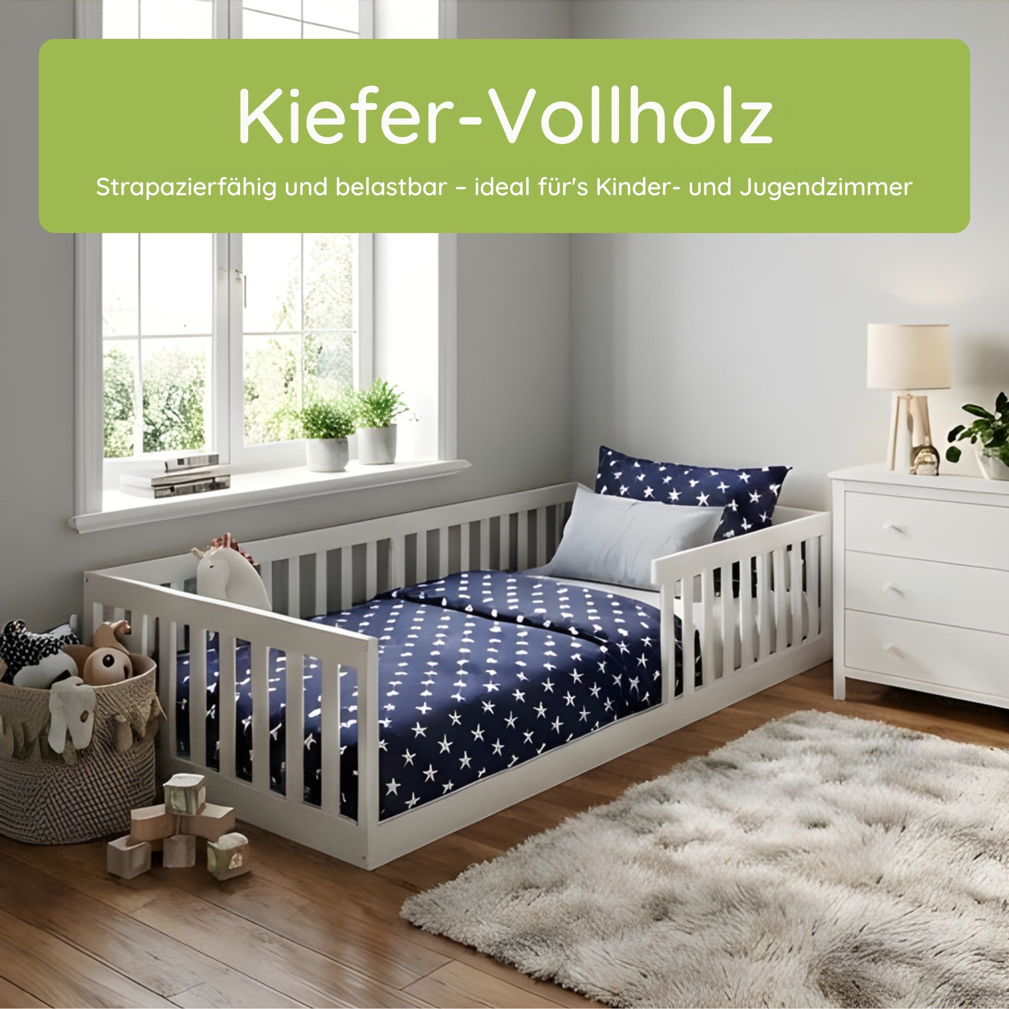 Dieses durchdachte Kinderbett in bodennaher Bauweise vereint kindgerechte Sicherheit, funktionales Design und eine zeitlose Optik. Als Bodenbett konzipiert, schafft es eine Schlafumgebung, die Geborgenheit vermittelt und gleichzeitig die Selbstständigkeit von Kindern fördert.