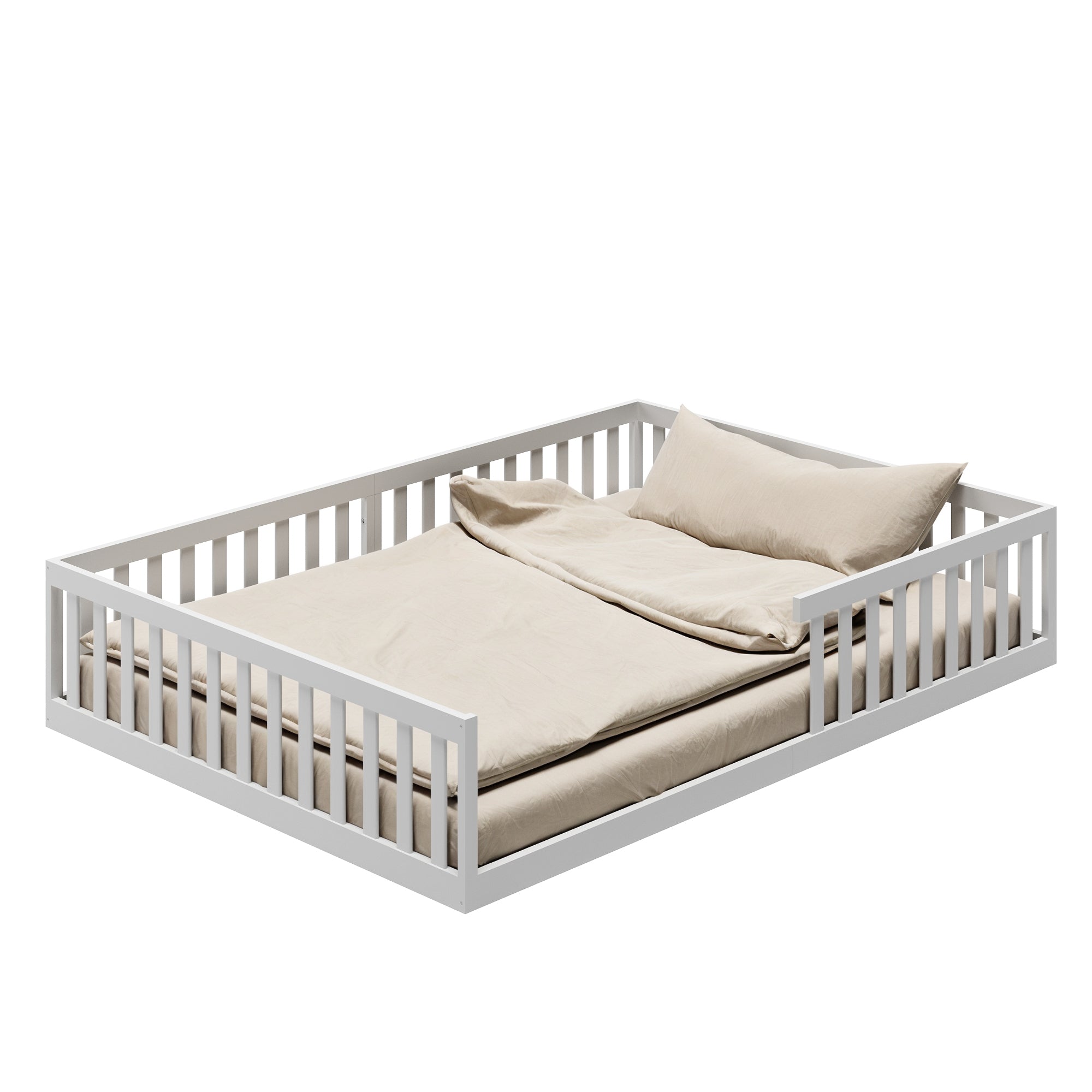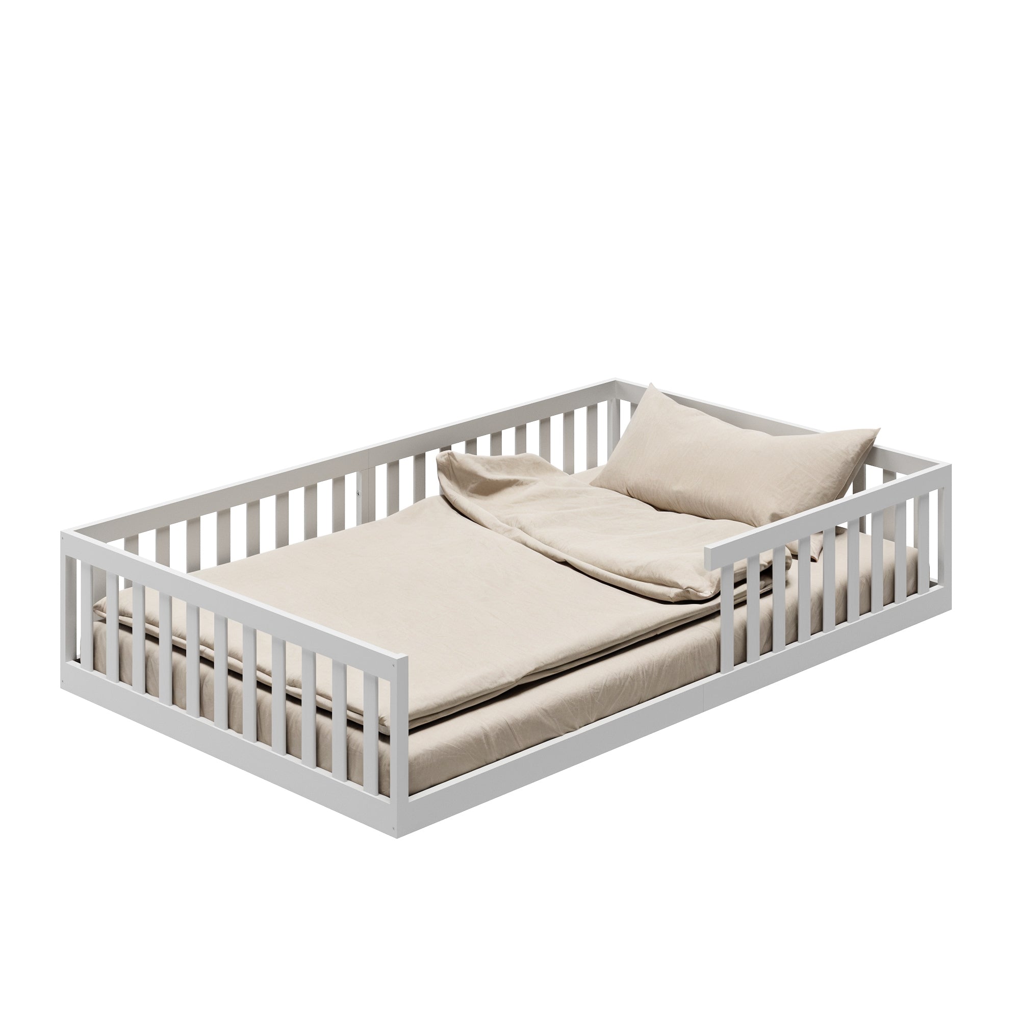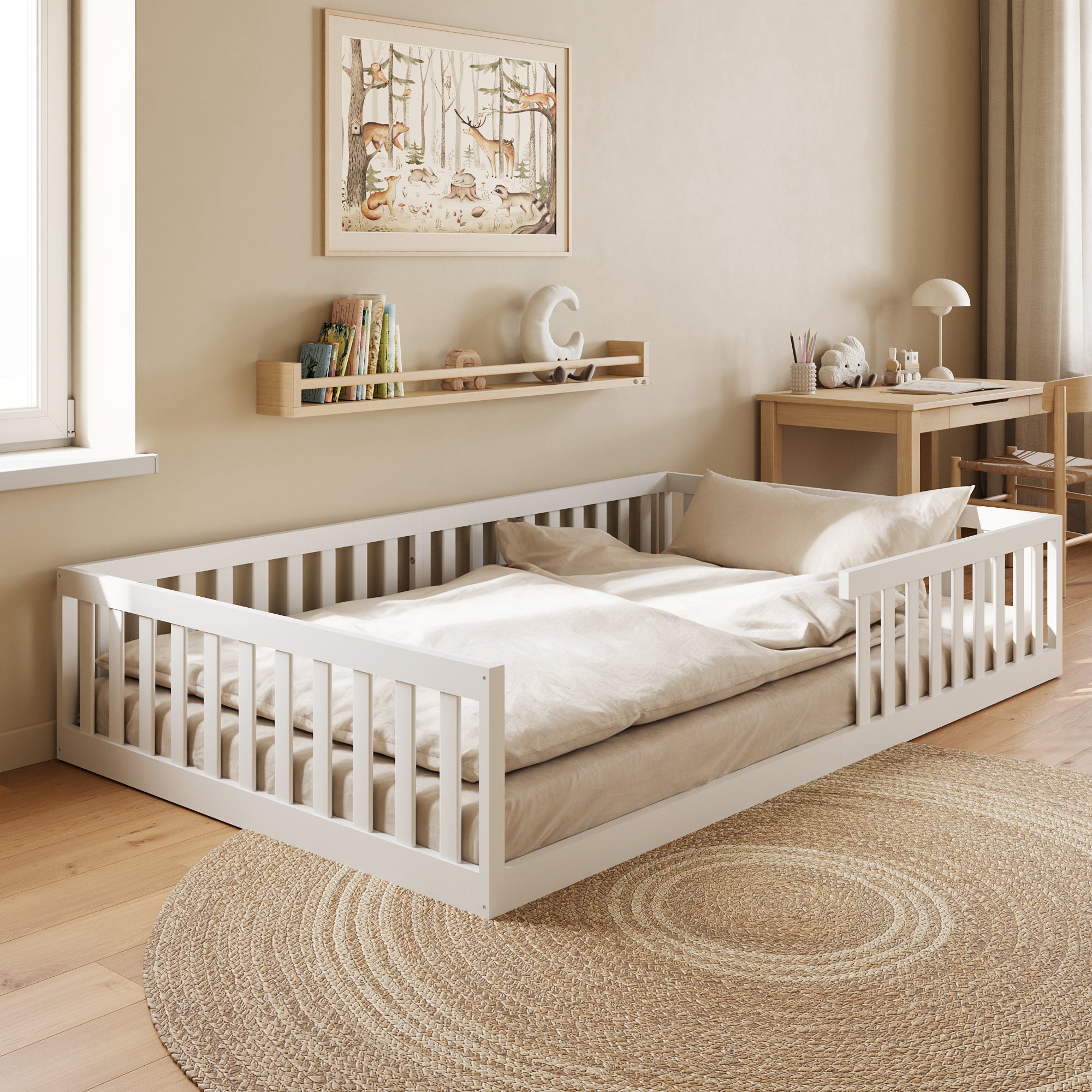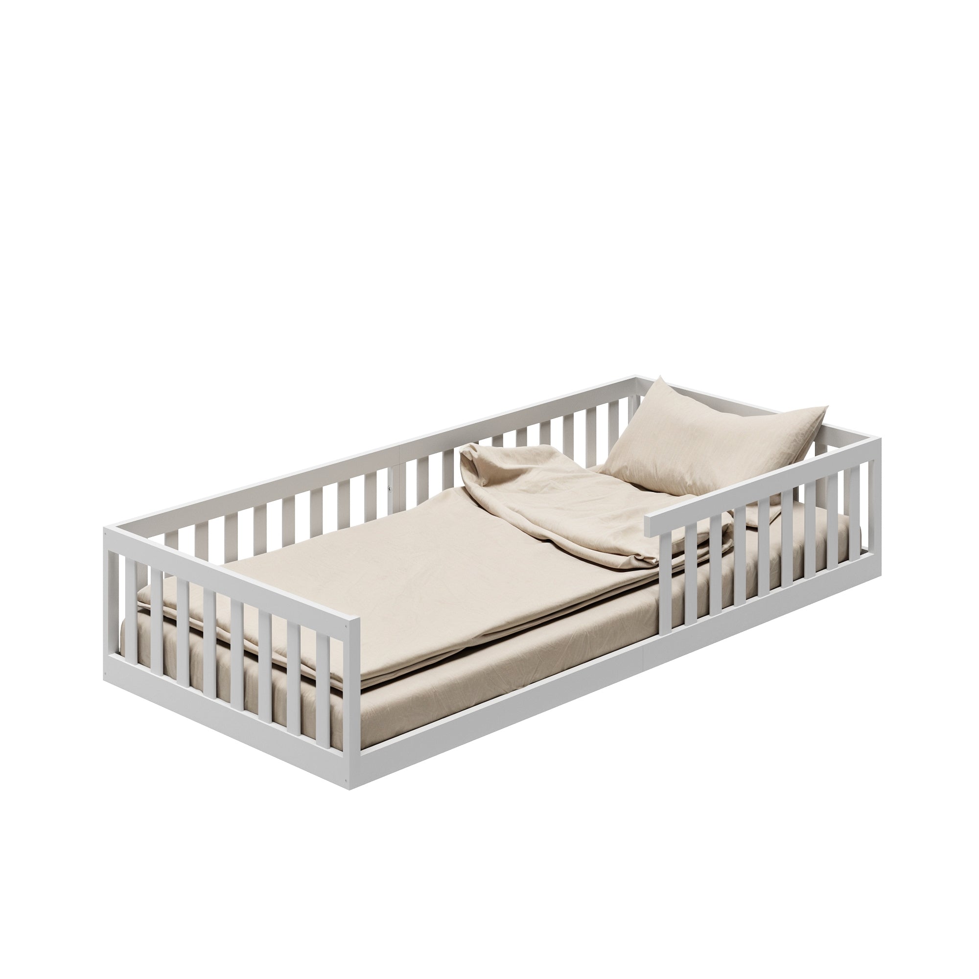 Abgerundete Kanten und ein schlichtes, modernes Design machen dieses Bodenbett für Kinder zu einer langlebigen Lösung. Es eignet sich nicht nur als klassisches Kinderbett, sondern kann auch später als Jugend- oder Einzelbett weiterverwendet werden.