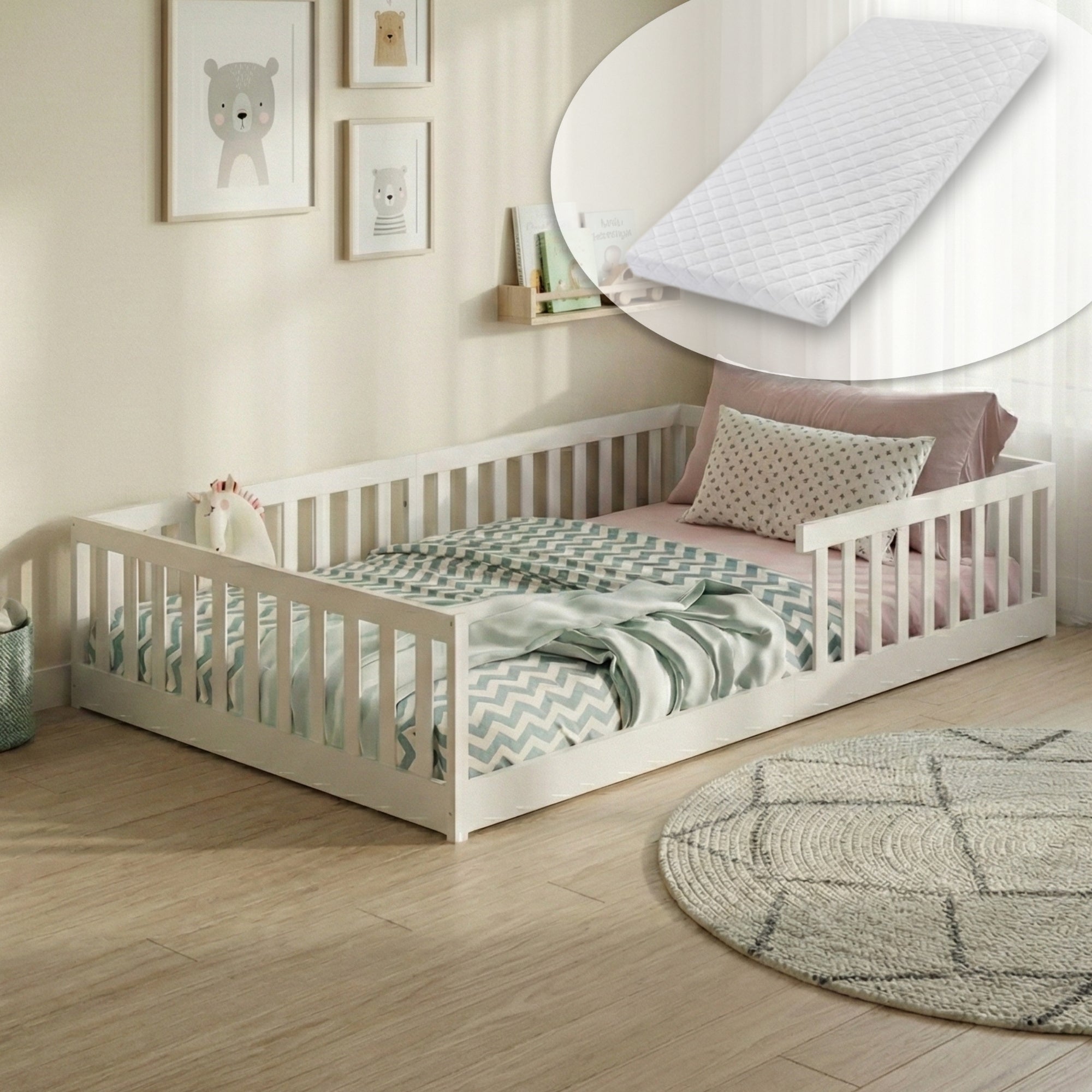 Nach den Prinzipien der Montessori-Pädagogik gestaltet, ermöglicht dieses Bodenbett auch kleinen Kindern ein einfaches Ein- und Aussteigen, was ihre Selbstständigkeit fördert. Die niedrige Bauweise hilft nicht nur beim sicheren Schlafen, sondern auch bei der Entwicklung motorischer Fähigkeiten.