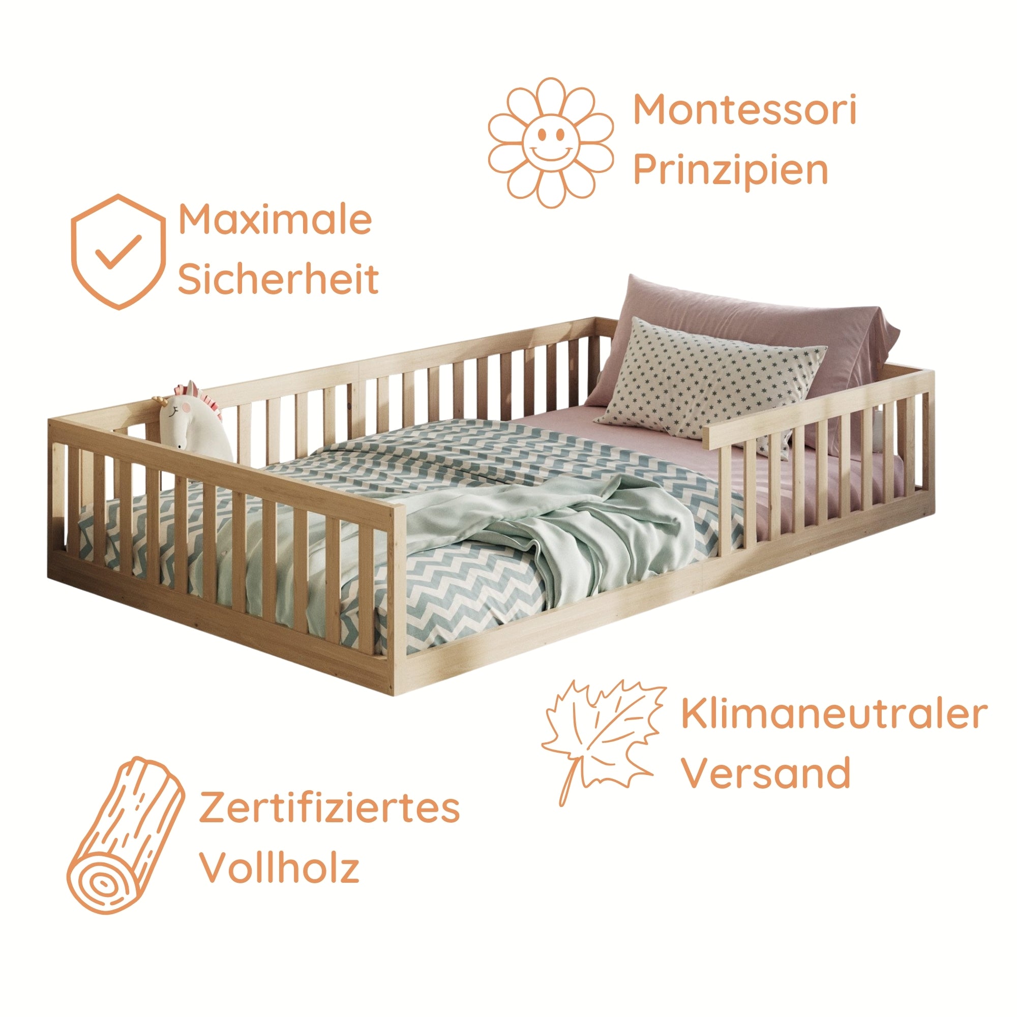 Montessori-Stil | Rausfallschutz & Lattenrost | Optional mit Matratze | 90–140 × 200 cm