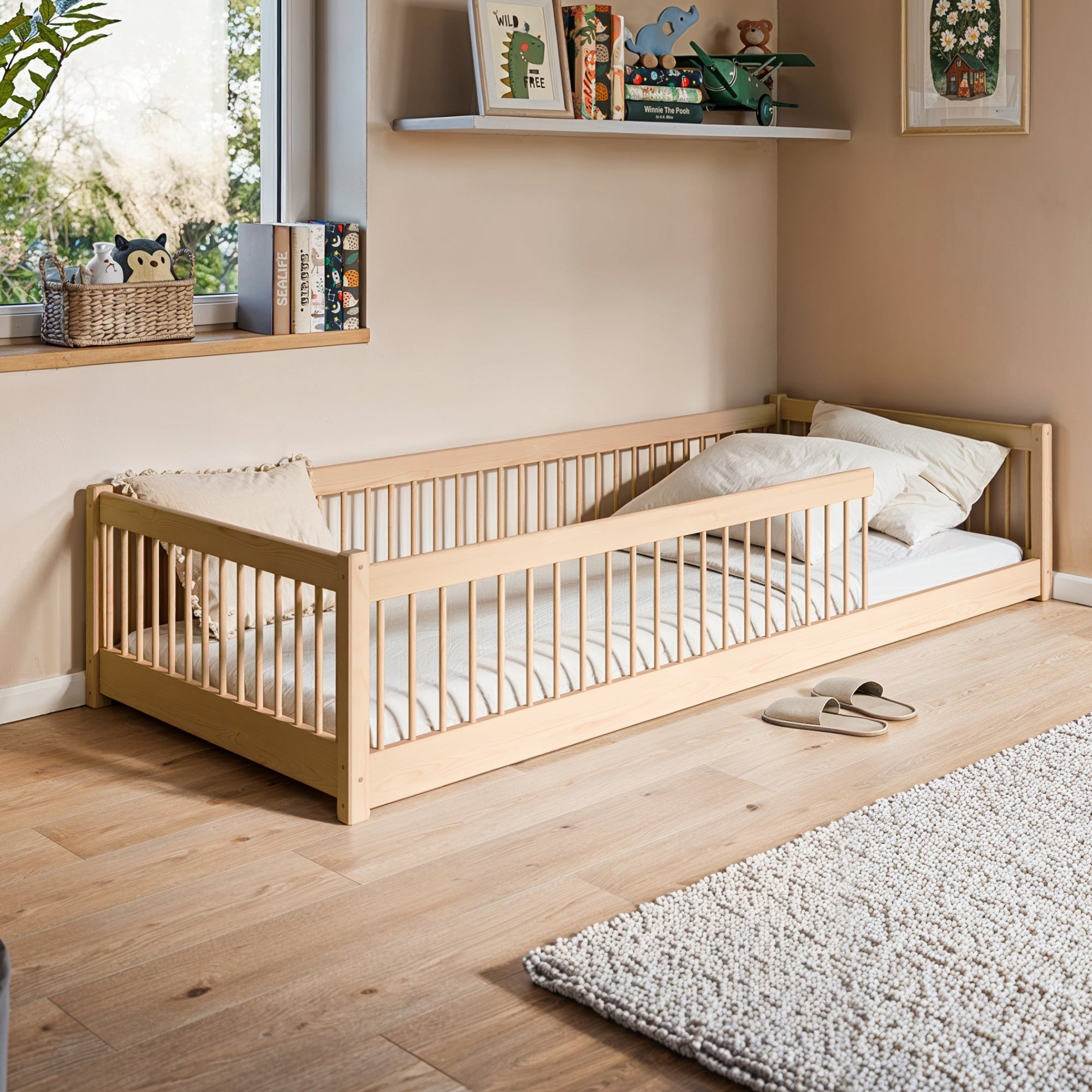 Montessori-Stil | Rausfallschutz & Lattenrost | Kiefer massiv | 90 × 200 cm