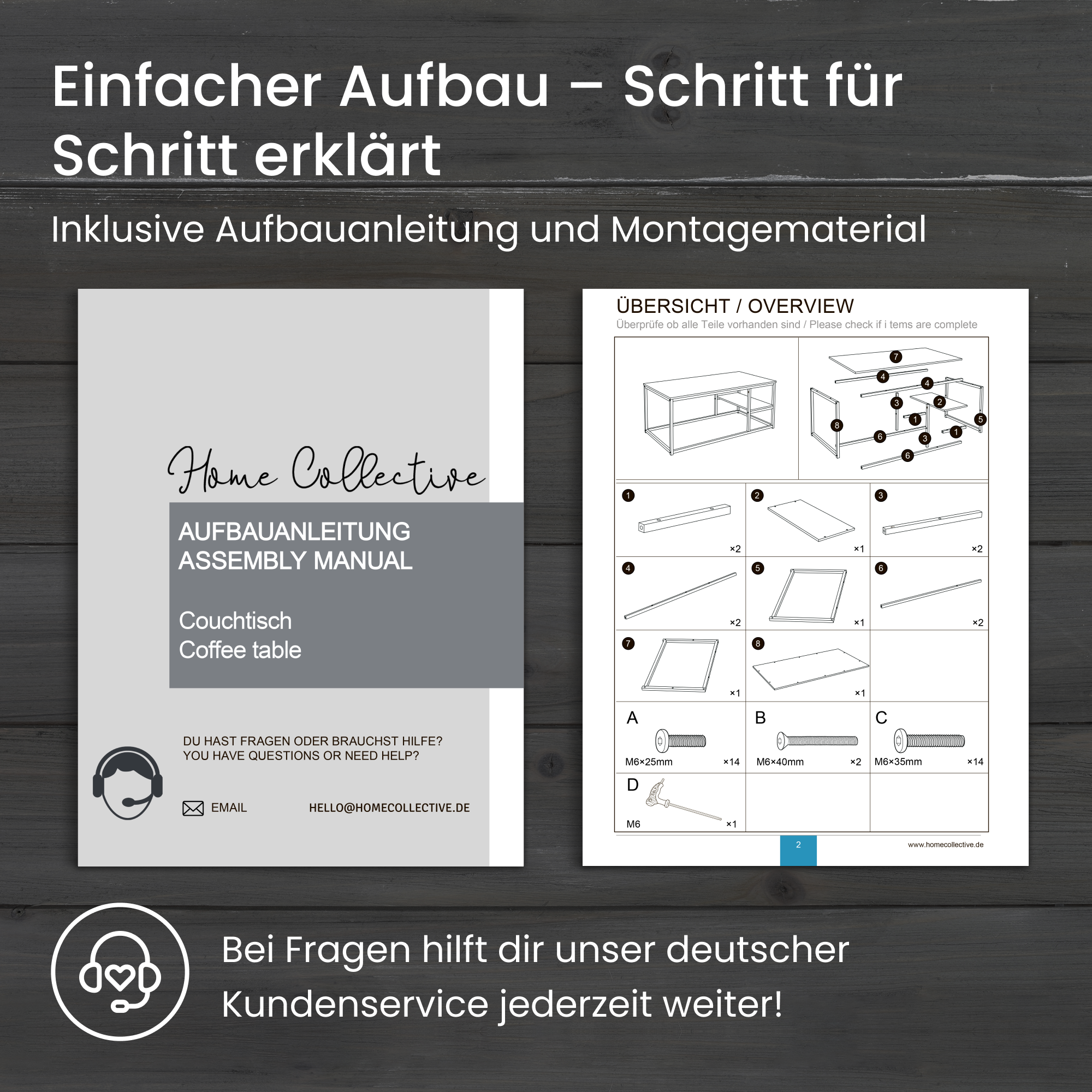 Die Selbstmontage gelingt einfach und schnell dank einer verständlichen Anleitung und beiliegendem Montagematerial. Innerhalb kurzer Zeit ist der Tisch einsatzbereit und bringt Struktur sowie Stil in Ihr Wohnzimmer.