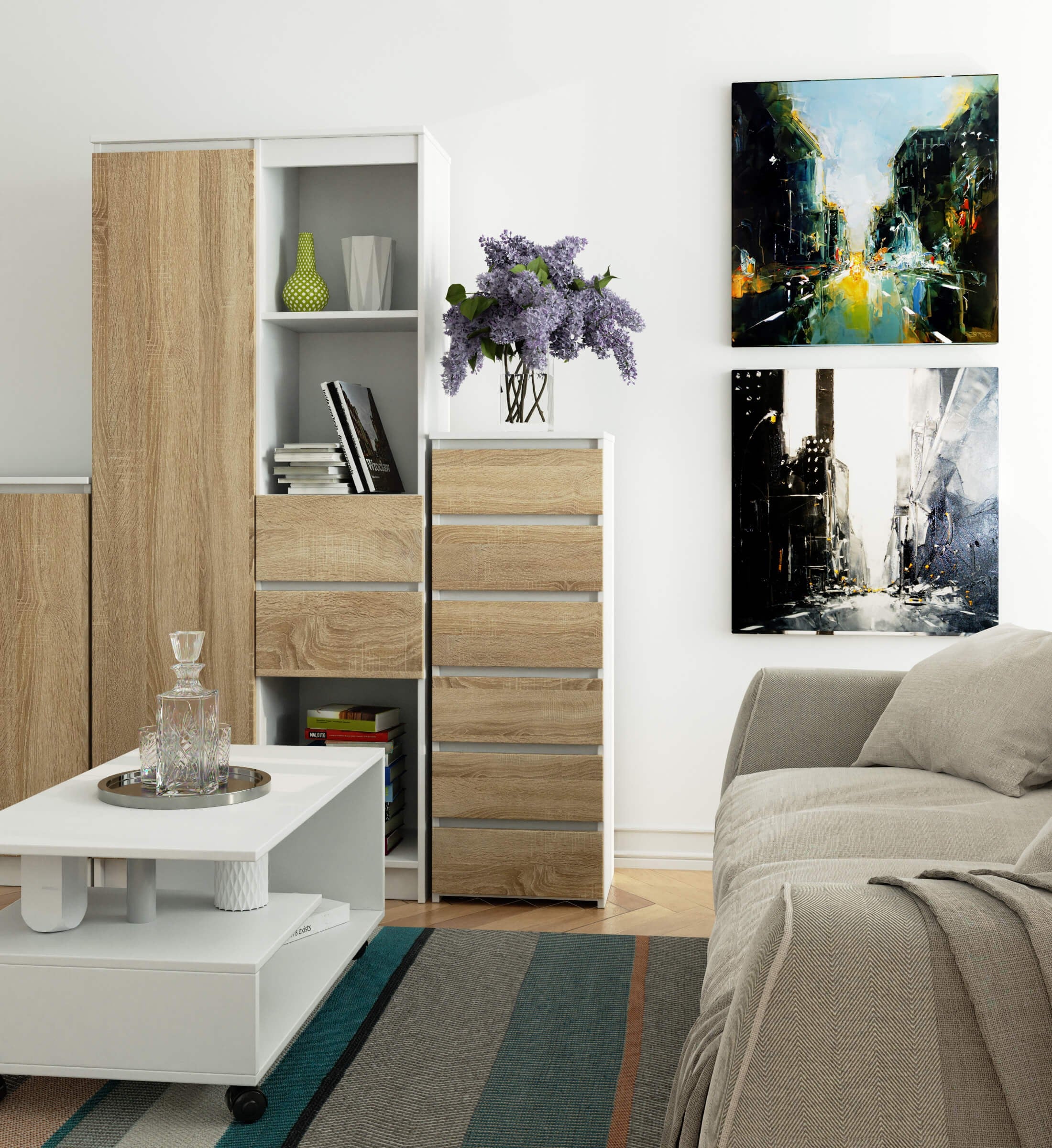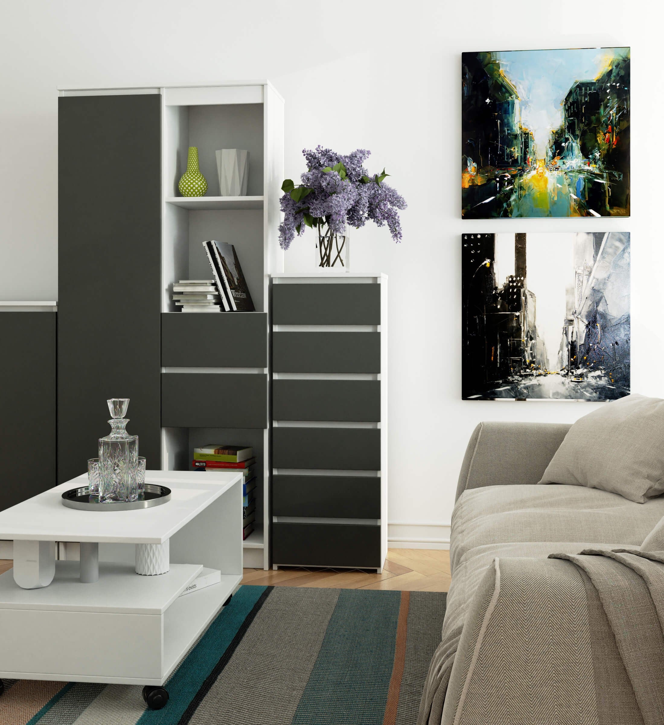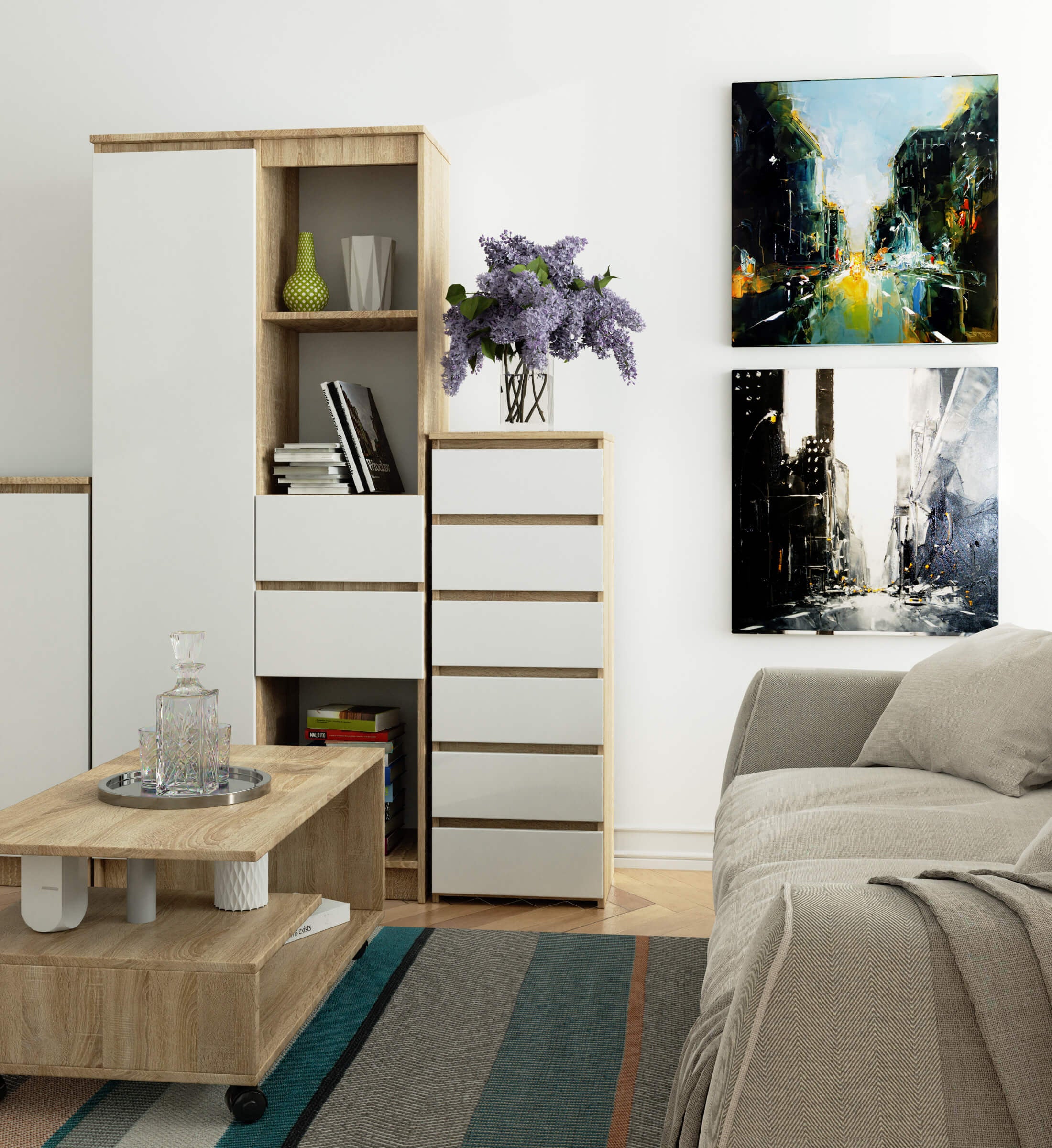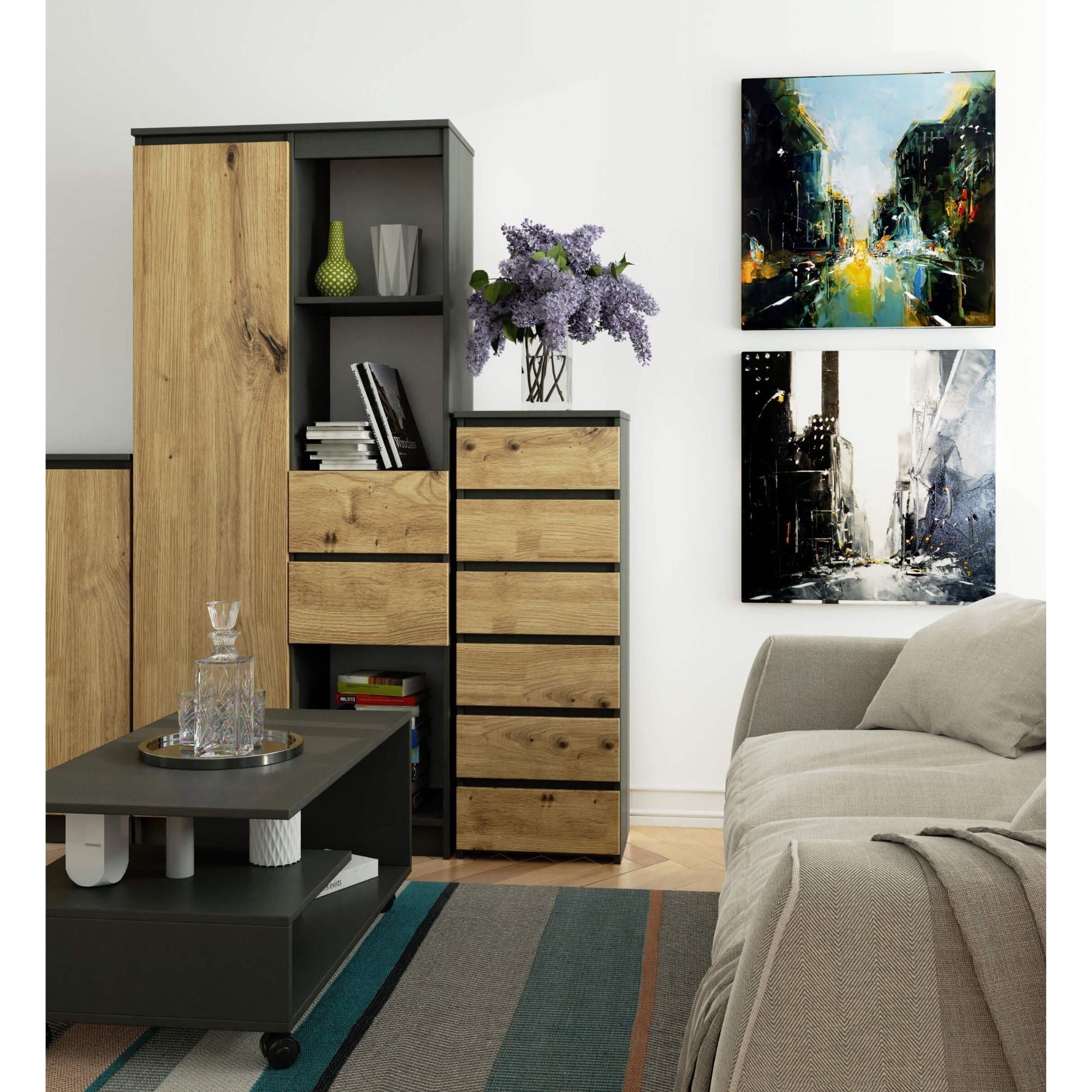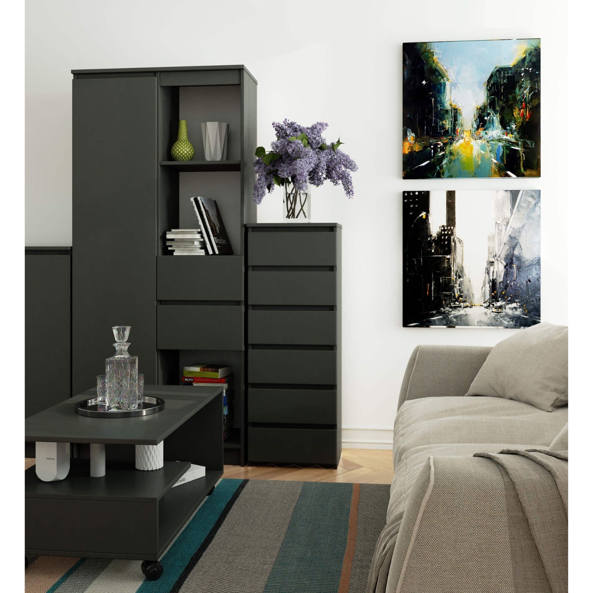 Le bon fonctionnement est assuré par les tiroirs qui coulissent sans effort sur des guides à rouleaux métalliques – le summum du confort d'utilisation. La conception durable avec une bande de chant en ABS sur le dessus, les côtés et les façades protège efficacement le buffet contre les dommages et offre une durabilité supplémentaire.