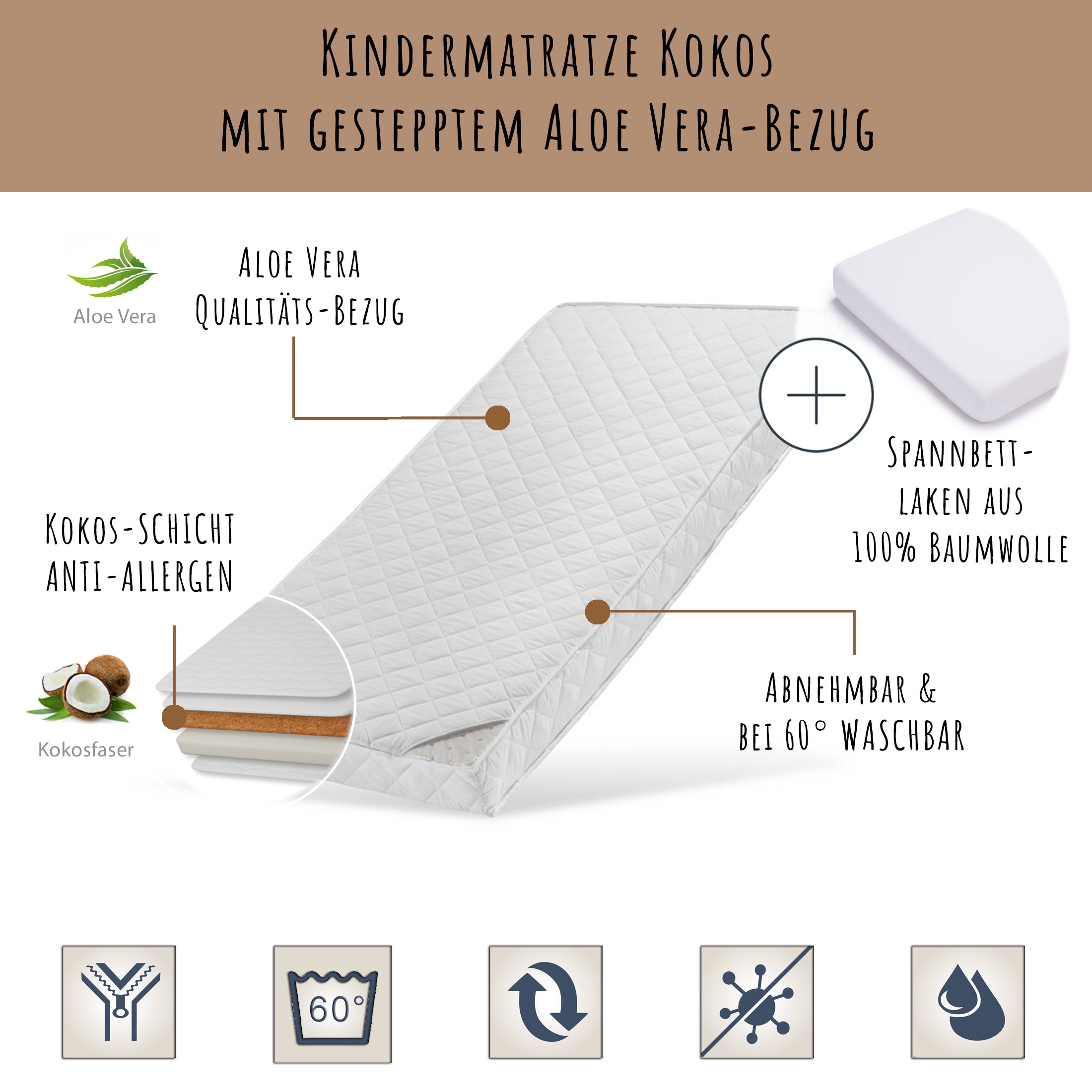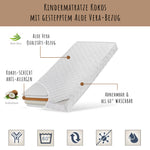 Kokos-Matratze | Aloe-Vera-Bezug | Optional Spannbettlaken | 10 cm | bis 60 kg | Viele Größen verfügbar