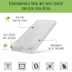 Notre matelas bébé et enfant Royal pour les parents exigeants. En utilisant des matériaux naturels de la plus haute qualité, nous avons développé un matelas de luxe avec une couche de latex et une housse à l'aloe vera. Il est respirant, s'adapte très bien au corps de l'enfant grâce à l'élasticité et à la durabilité exceptionnelles du latex naturel et, bien sûr, il est facile à nettoyer en cas de problème - grâce à la housse amovible. Il convient aux dormeurs sur le côté, sur le ventre et sur le dos, a un effet régulateur d'humidité, dissipe la chaleur et offre à nos enfants un sommeil réparateur en tout temps. Pour que les nuits soient calmes et que la matinée puisse commencer avec pleine énergie. En option avec drap-housse 100% coton.