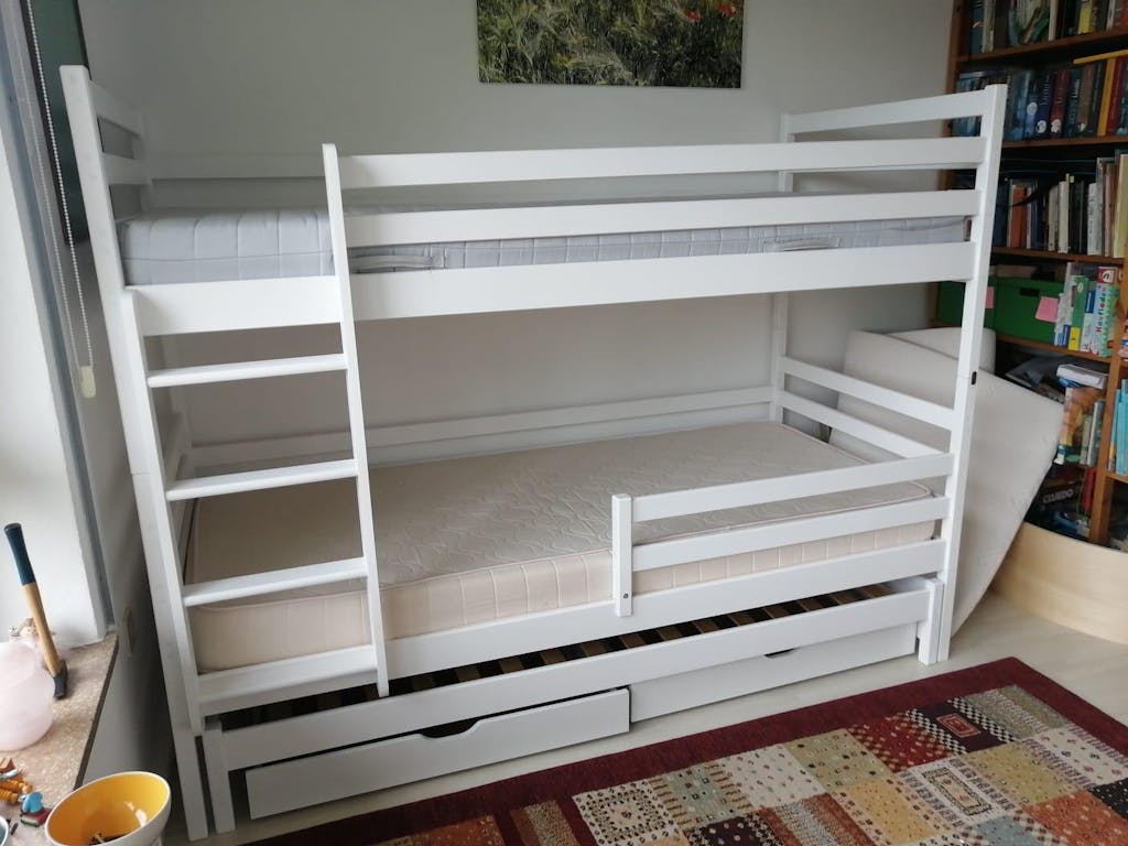 Dieses Etagenbett mit ausziehbarem Gästebett bietet die perfekte Schlafmöglichkeit für meine Kinder und ihre Übernachtungsgäste. Wenn kein zusätzliches Bett benötigt wird, verschwindet das Gästebett einfach unter dem unteren Bett und bietet zusätzlichen Stauraum.