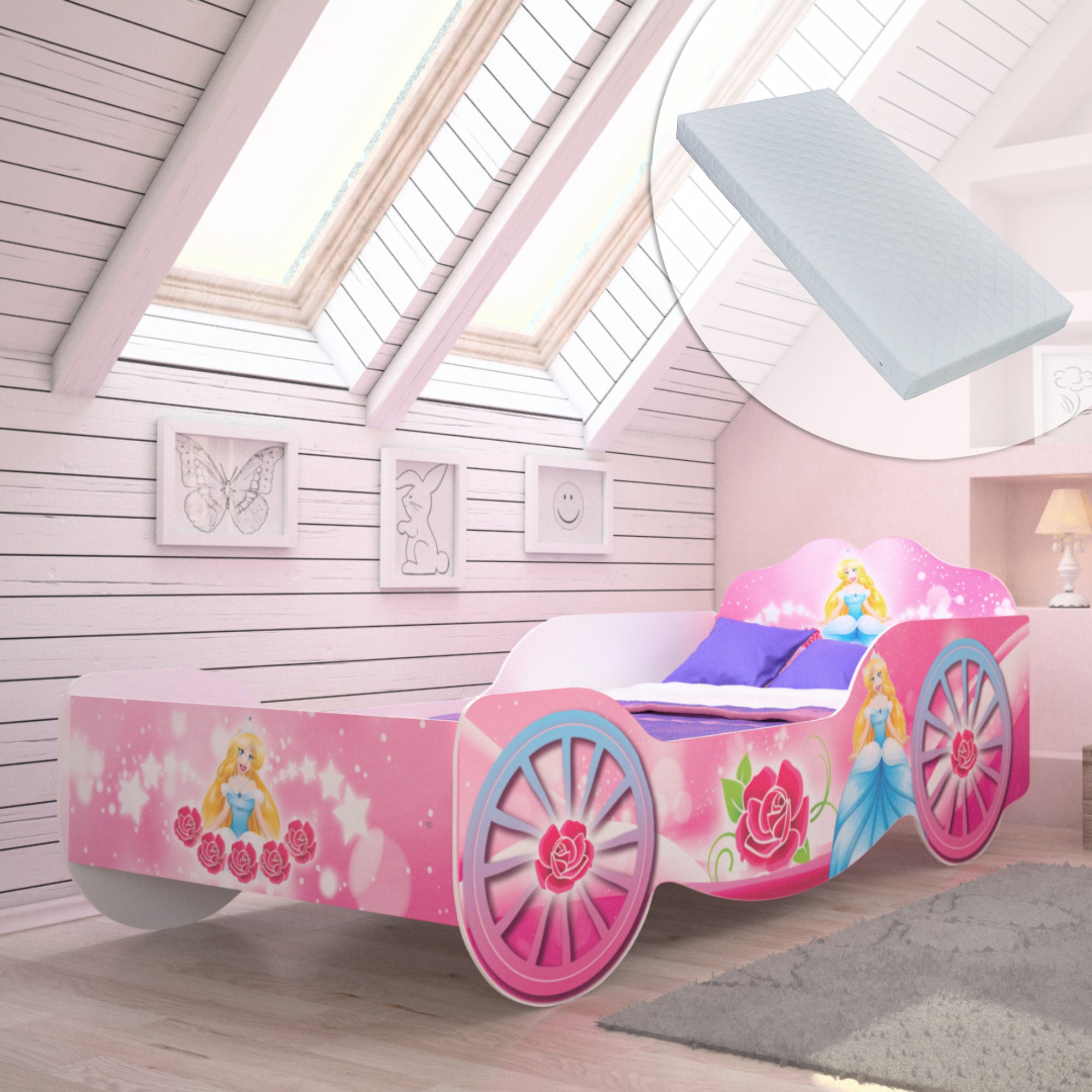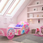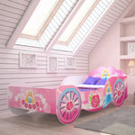 Ce carrosse fait battre plus fort le cœur des princesses. Le lit, fabriqué à partir de bois MDF de haute qualité, est fabriqué par une petite entreprise familiale de l'Union européenne. Les panneaux latéraux servent également de protection contre les chutes, afin que votre enfant soit en sécurité à tout moment, même lorsqu'il joue ou fait de longs rêves. Le cadre bas permet aux tout-petits d'entrer et de sortir plus facilement et de manière indépendante. Peut supporter jusqu'à 120 kilogrammes, les parents peuvent donc également y entrer occasionnellement. Un sommier à lattes enroulable robuste est inclus.