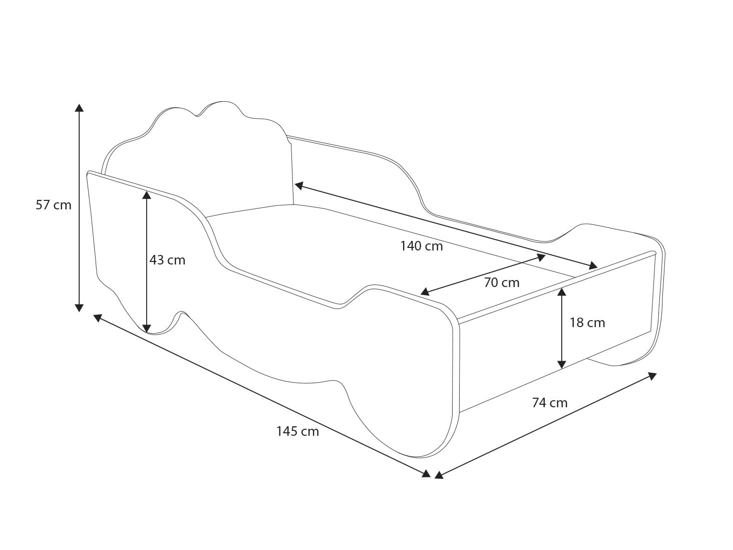 • Dimensions extérieures du couchage 70x140 : 145x74x57 cm (longueur x largeur x hauteur)