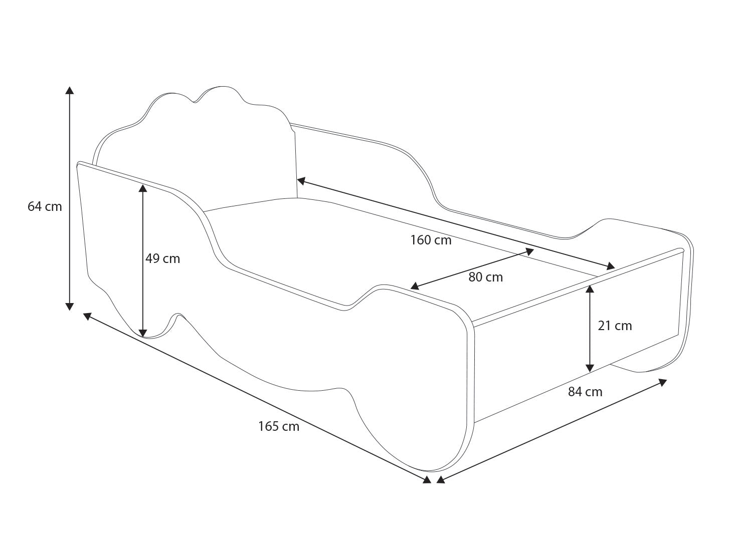 • Dimensions extérieures du couchage 80x160 : 165x84x64 cm (longueur x largeur x hauteur)