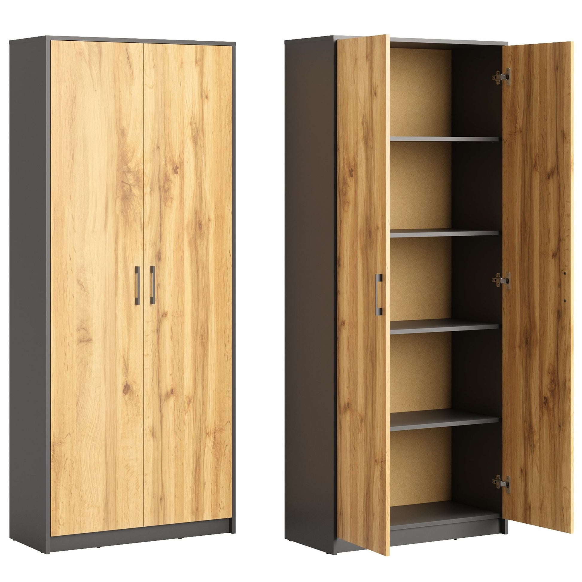 Im Inneren sorgen vier Einlegeböden für eine praktische Fächeraufteilung mit fünf Stauräumen, die vielfältige Einsatzmöglichkeiten bieten. Ob zur Aufbewahrung von Aktenordnern, Büchern, Putzmitteln, Vorräten oder anderen Haushaltsutensilien – dieser Haushaltsschrank bringt Struktur in Ihren Alltag.