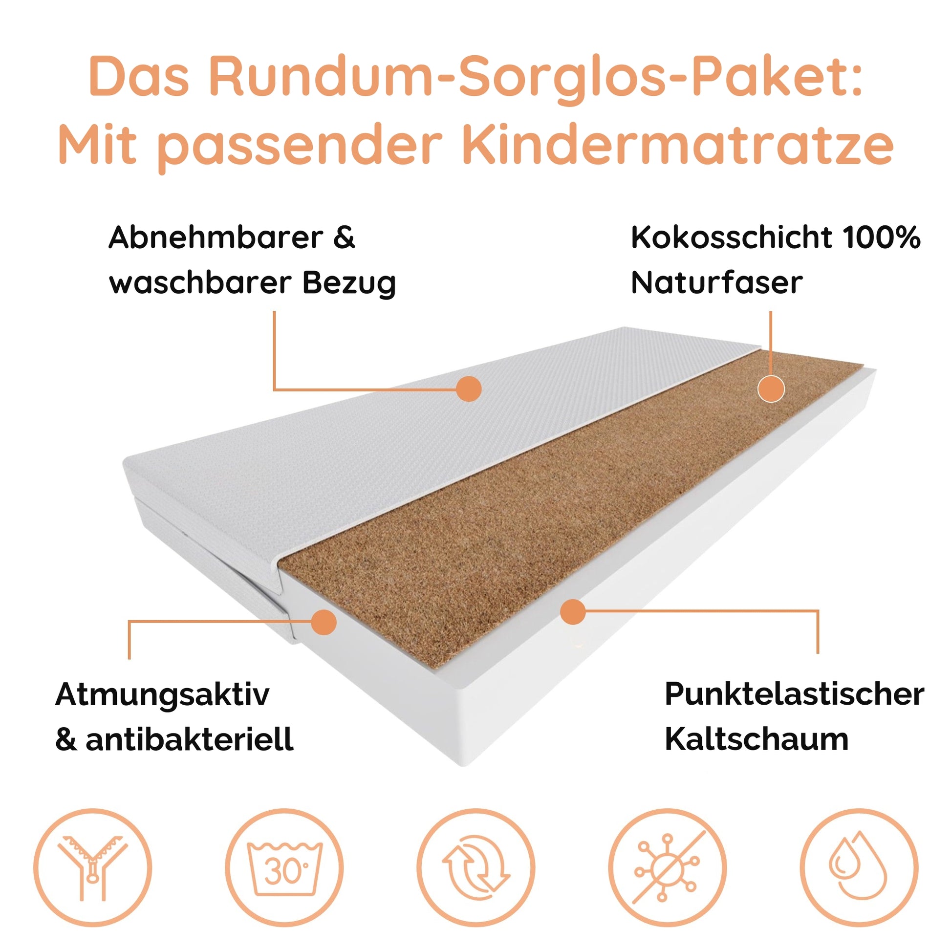 Gefertigt wird das Bett aus robustem MDF-Holzwerkstoff in einem europäischen Familienbetrieb. Die hochwertige Lackierung auf Wasserbasis ist speichelfest und für den Alltag mit Kindern geeignet. Abgerundete Kanten sorgen für zusätzliche Sicherheit beim Spielen und Schlafen.