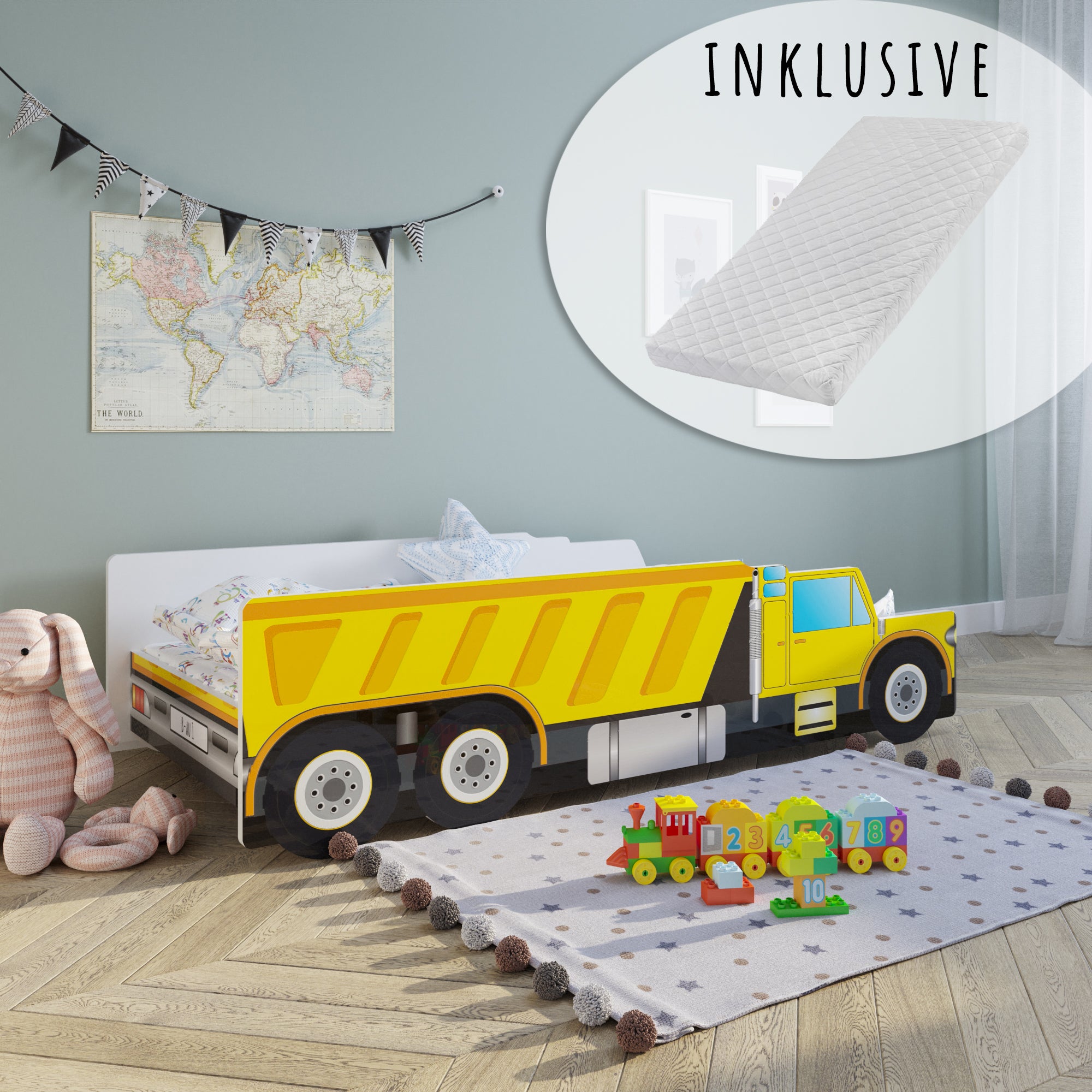 Dieses Baustellenfahrzeug vom Typ Kipplader lässt Kinderherzen höher schlagen. Das aus hochwertigem MDF-Holzwerkstoff gefertigte Bett wird von einem kleinen Familienunternehmen in der Europäischen Union hergestellt. Die Seitenteile dienen gleichzeitig als Rausfallschutz, sodass Ihr Kind auch bei wilden Fahrten oder ausgiebigen Träumen jederzeit sicher ist. Der niedrige Rahmen erleichtert das selbständige Ein- und Aussteigen der Kleinen. Belastbar bis 120 Kilogramm, sodass auch die Eltern gelegentlich mit einsteigen können. Ein stabiles Roll-Lattenrost ist im Lieferumfang enthalten.