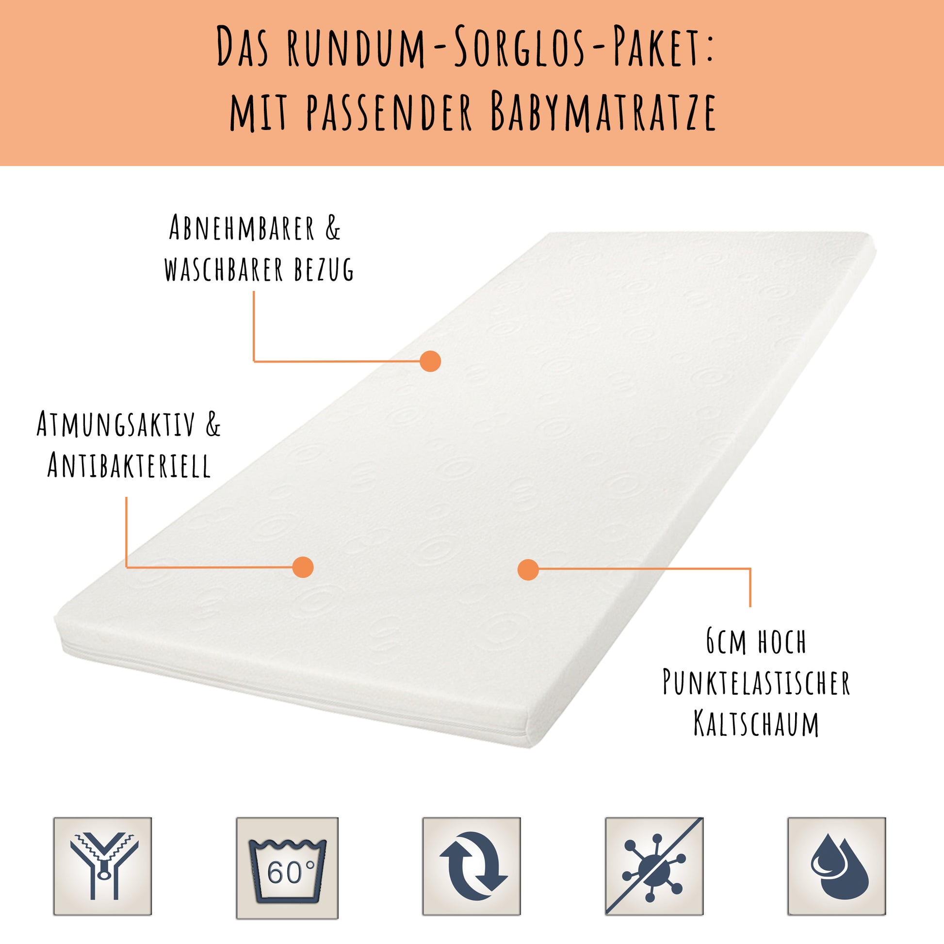 Babybett Gitterbett 60x120 cm mit Matratze (optional) höhenverstellbar | herausnehmbare Sprossen Stäbe weiß, grau oder natur Made in Europe