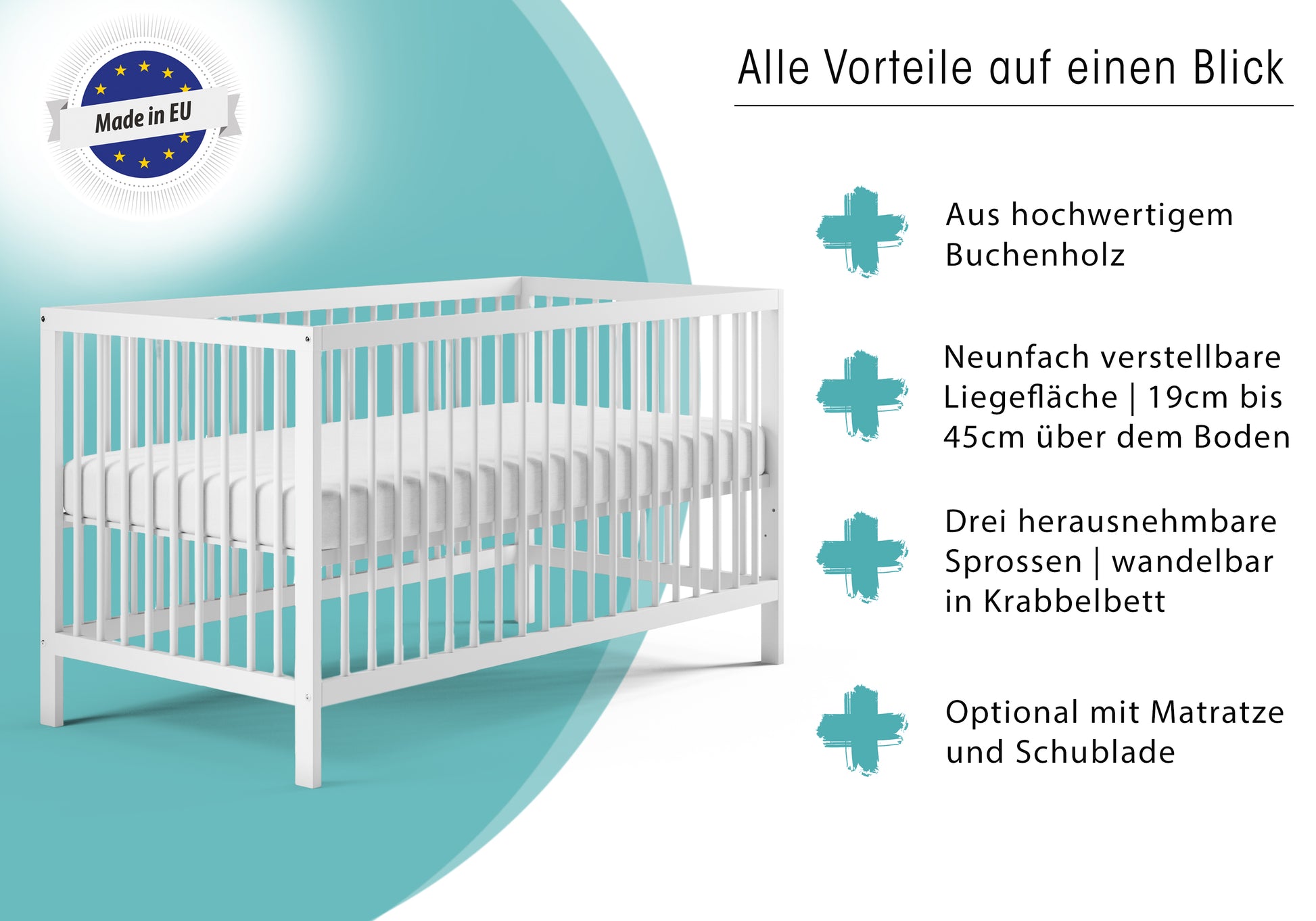 Kids Collective Babybett Kinderbett Gitterbett 60x120 und 70x140 cm höhenverstellbarer Lattenrost & herausnehmbare Sprossen stabiles Buchenholz | ab Geburt bis zum 3. Lebensjahr made in EU