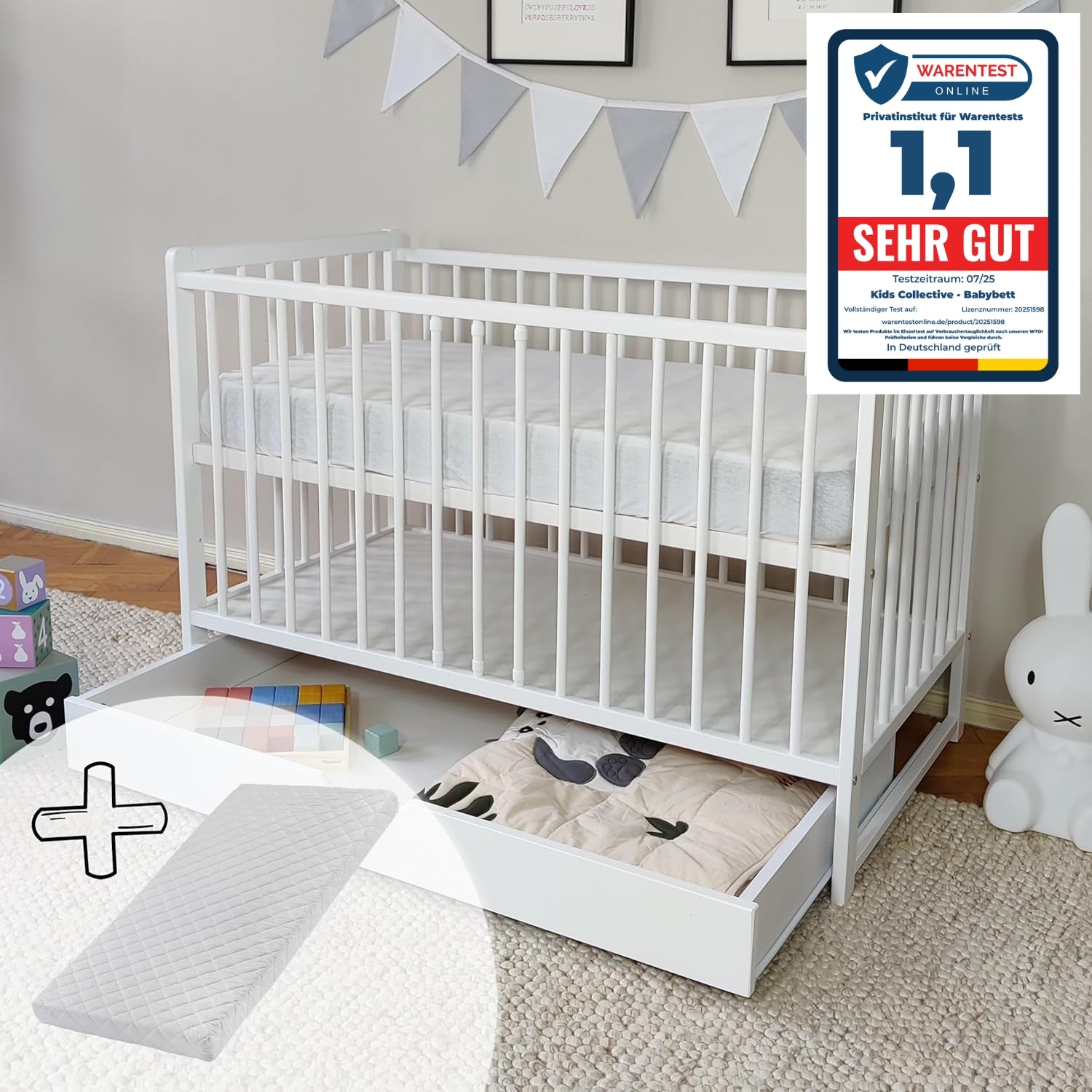 Babybett Kinderbett 60x120 Gitterbett Baby Bett Komplett-Set mit Matratze Beistellbett mitwachsend, Lattenrost höhenverstellbar mit abnehmbaren Sprossen, mit Schublade | weiß Kiefer-Vollholz