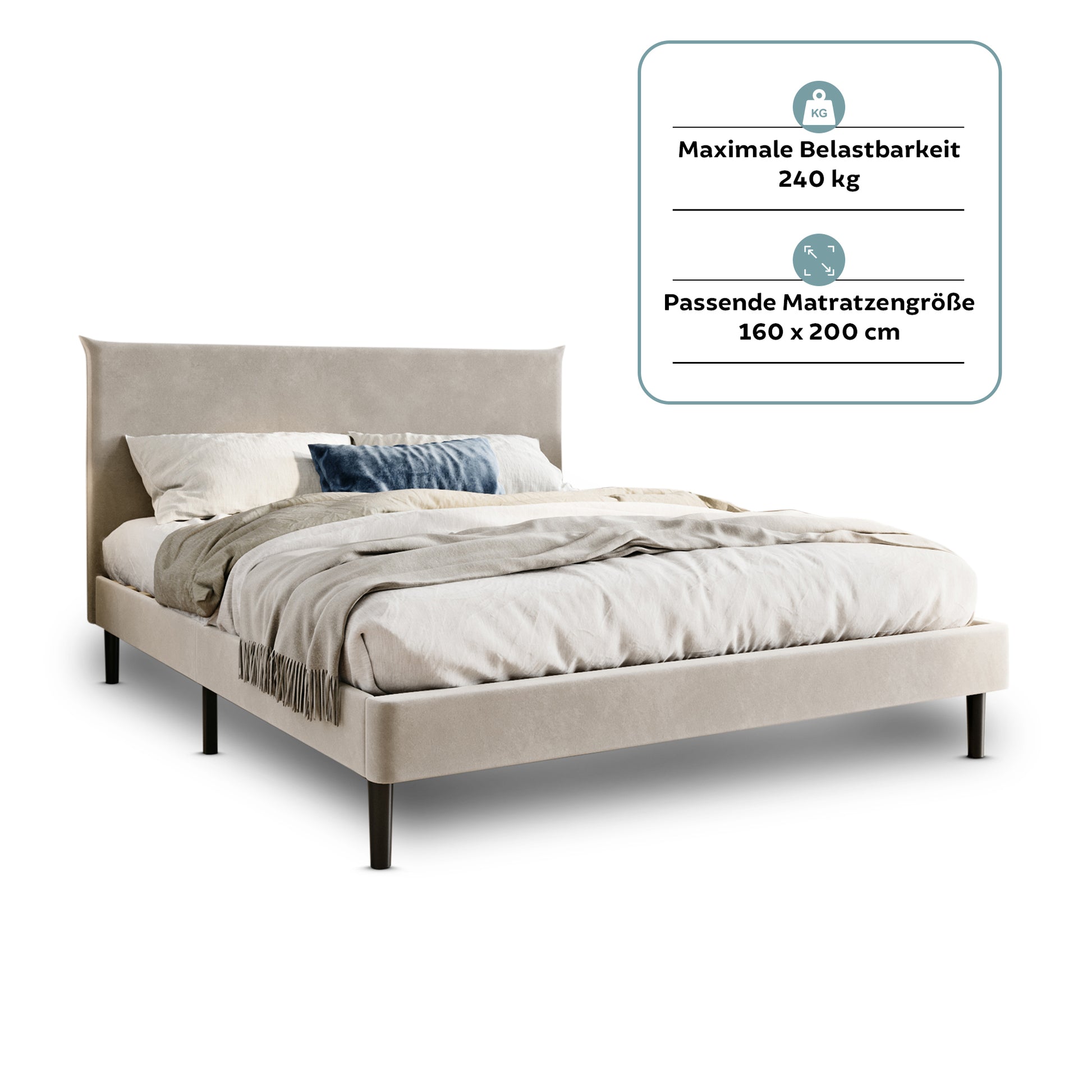 Dieses moderne Polsterbett kombiniert stilvolles Design mit hohem Komfort und ist in zwei eleganten Farben – Grau und Beige – sowie in zwei hochwertigen Stoffvarianten – Cord und Samt – erhältlich. Mit den verfügbaren Maßen 140x200 cm und 160x200 cm passt sich das Bett ideal verschiedenen Raumgrößen an.
