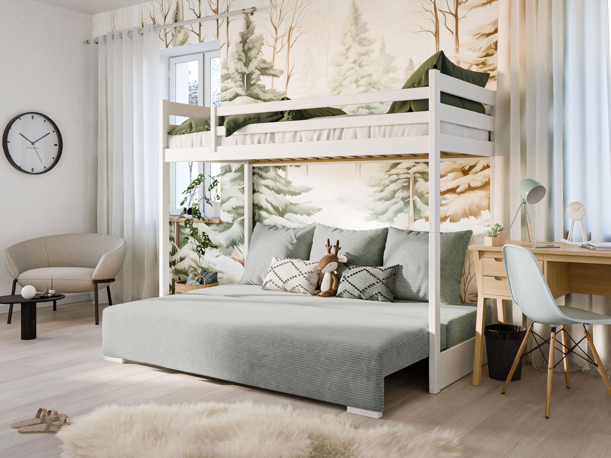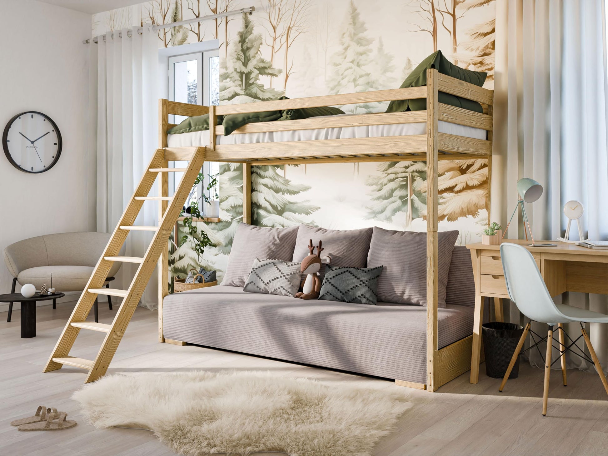 Dank zurückhaltendem Design fügt sich das Etagenbett harmonisch in Wohnzimmer oder Kinderzimmer ein und schafft unter der Liegefläche zusätzlichen Raum für Spielzeugkisten, Schreibtisch oder Leseecke. Der OEKO-TEX-zertifizierte Bezug ist abriebfest und leicht zu reinigen – ideal für den lebhaften Familienalltag.