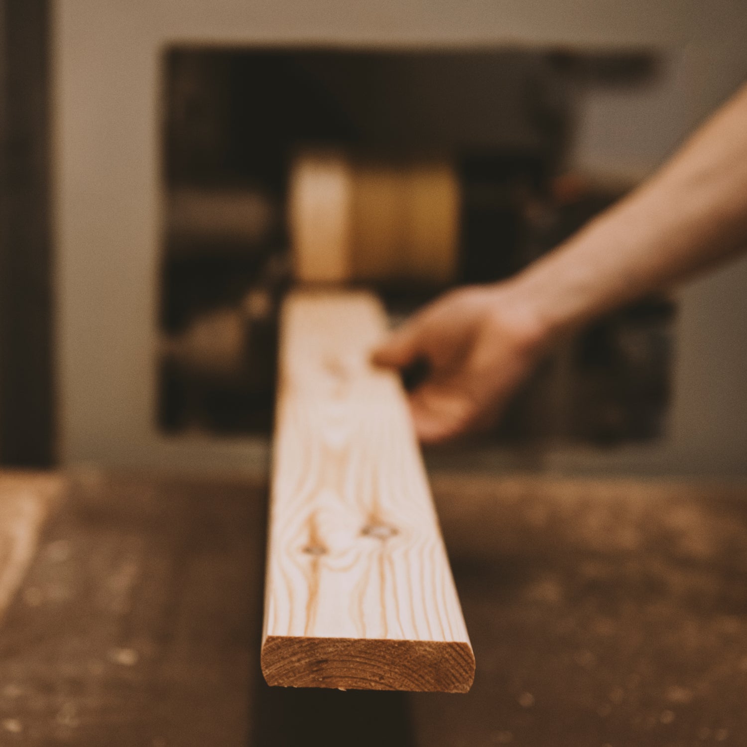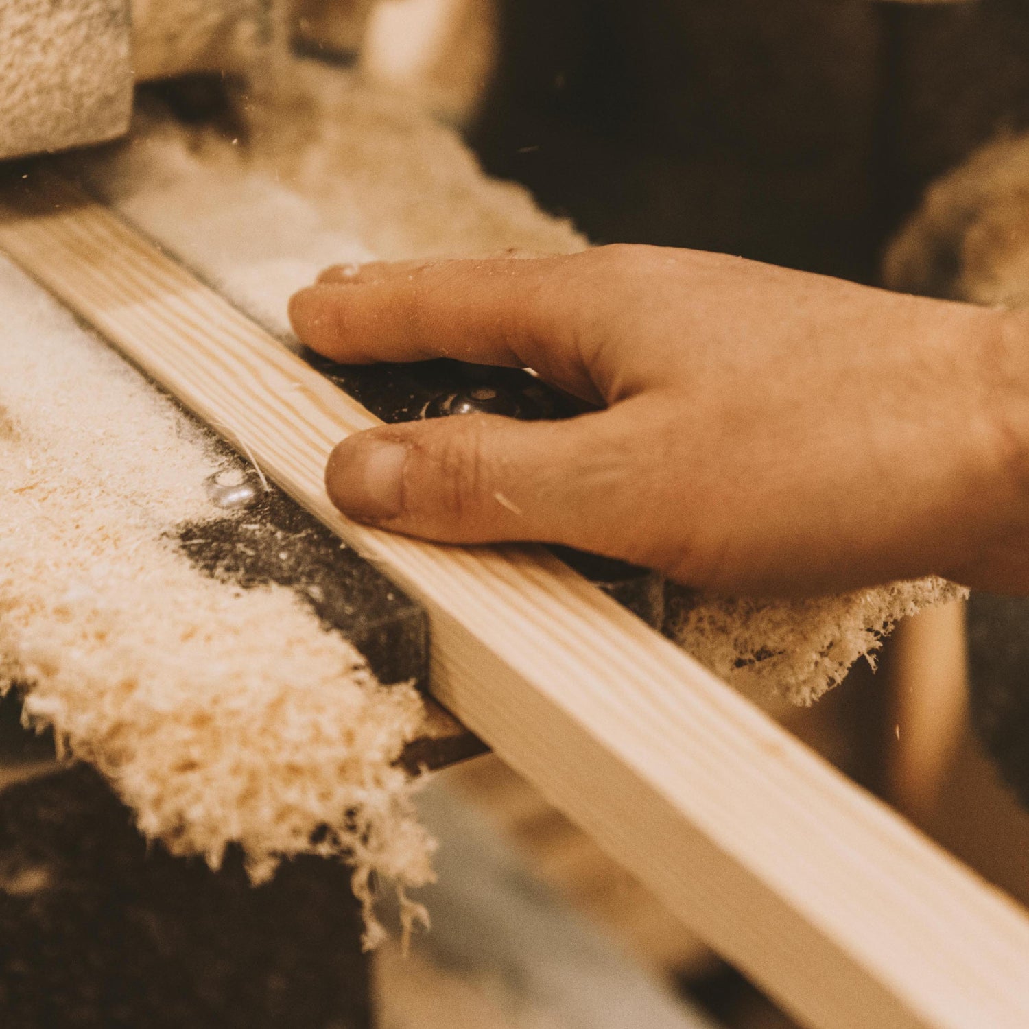Unser Holz stammt aus 100% FSC-zertifizierten Wäldern. Größere Holzreste verleimen wir wieder, sodass sie in der Produktion wiederverwendet werden können. Was dann noch übrig bleibt, wird im Pellet-Ofen zum Heizen unserer hochmodernen Produktionshalle verwendet.