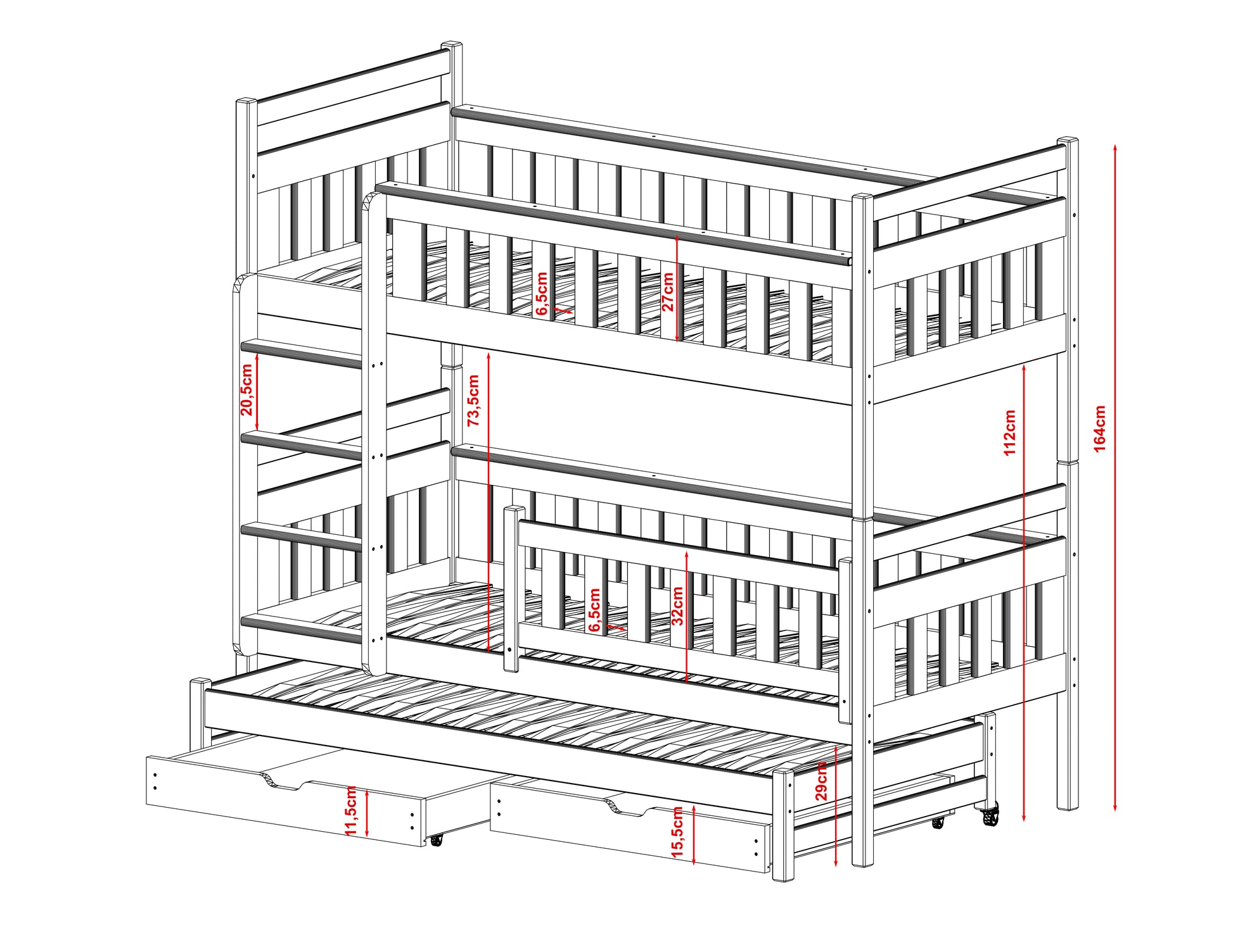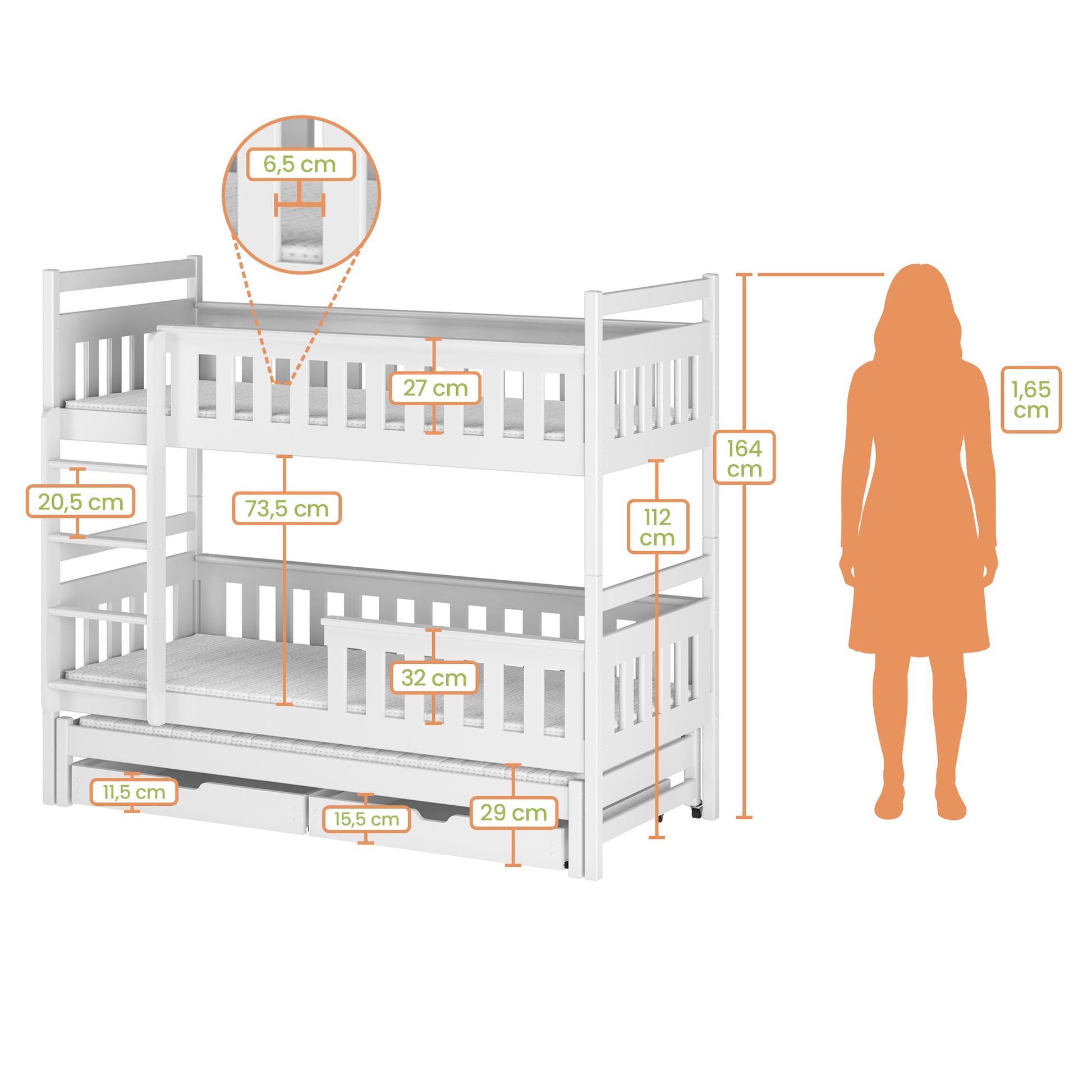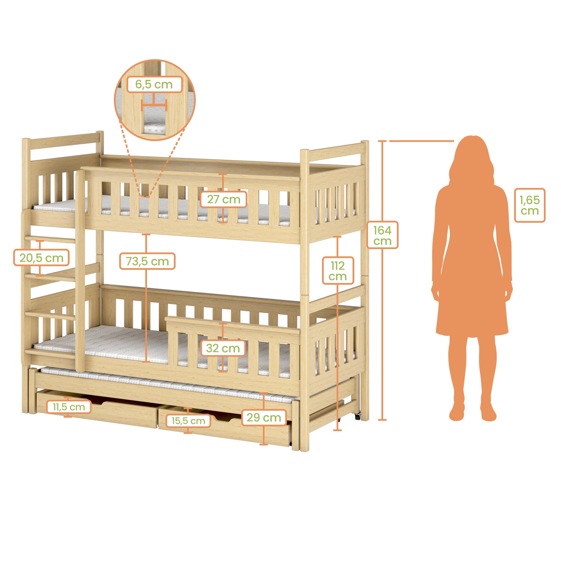 Sicherheit steht bei uns an erster Stelle. Unser Bett ist aus FSC Kiefer-Vollholz gefertigt und nach den höchsten Normen zertifiziert. Die verwendeten Farben sind wasserbasiert, kinderfreundlich und geruchslos. Sie sind leck- und speichelfest, sodass Sie sich keine Sorgen um die Gesundheit Ihres Kindes machen müssen. Unser Bett ist so konstruiert, dass es bis zu 100 kg auf jeder Liegefläche tragen kann, was Ihnen zusätzliche Sicherheit gibt.