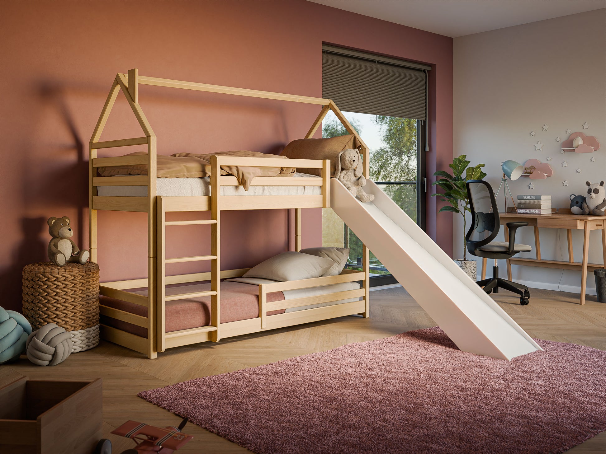 Hochbett mit Rutsche 90x200 cm, Hausbett, Etagenbett mit Rausfallschutz und Leiter, Bett Bed Bodenbett Jugendbett Spielbett für 2 Kinder, Kinderzimmer Sicherheit, Stabil Kiefer Holz massiv