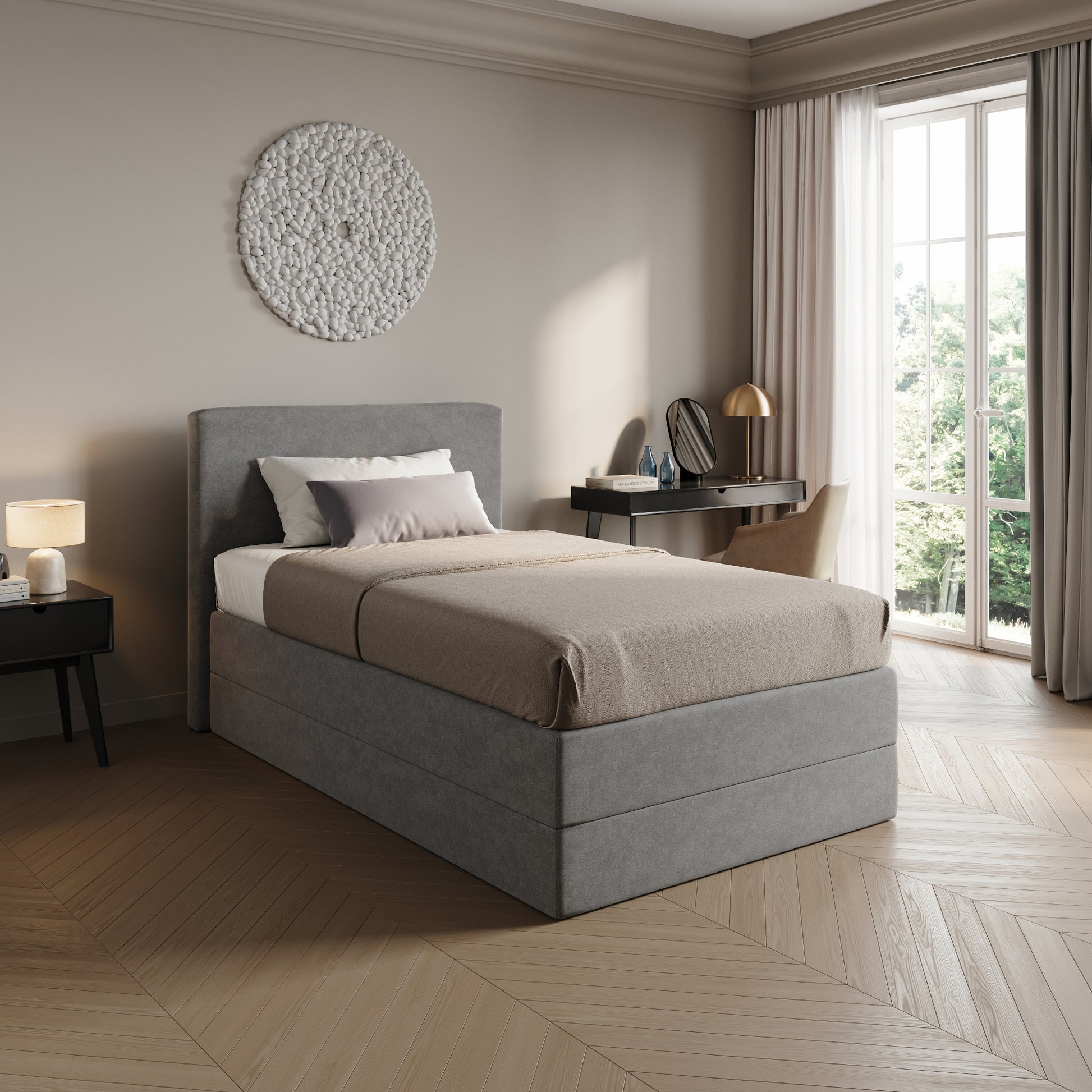 Stabiles Bettgestell mit integrierter Boxunterfederung (Bonnell-Federkern), Bezug aus pflegeleichtem Microvelours, optional gepolstertes Kopfteil