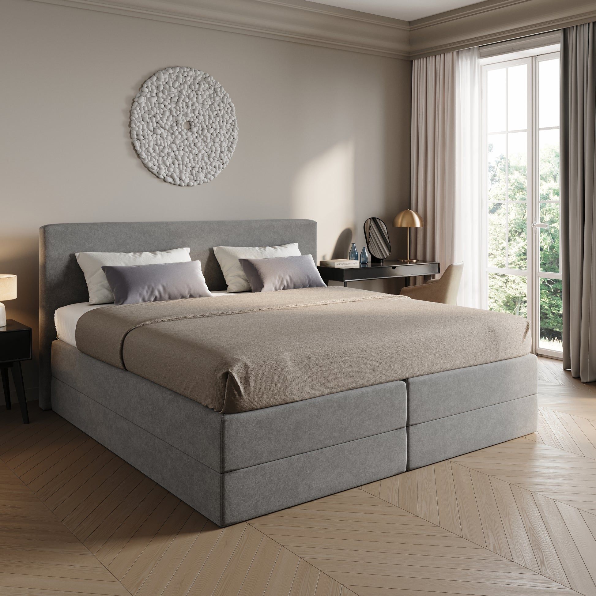 Ab einer Breite von 160 cm wird das Boxspringbett mit zwei separaten Matratzen geliefert, wodurch individueller Liegekomfort und optimale Unterstützung auf jeder Bettseite gewährleistet werden.