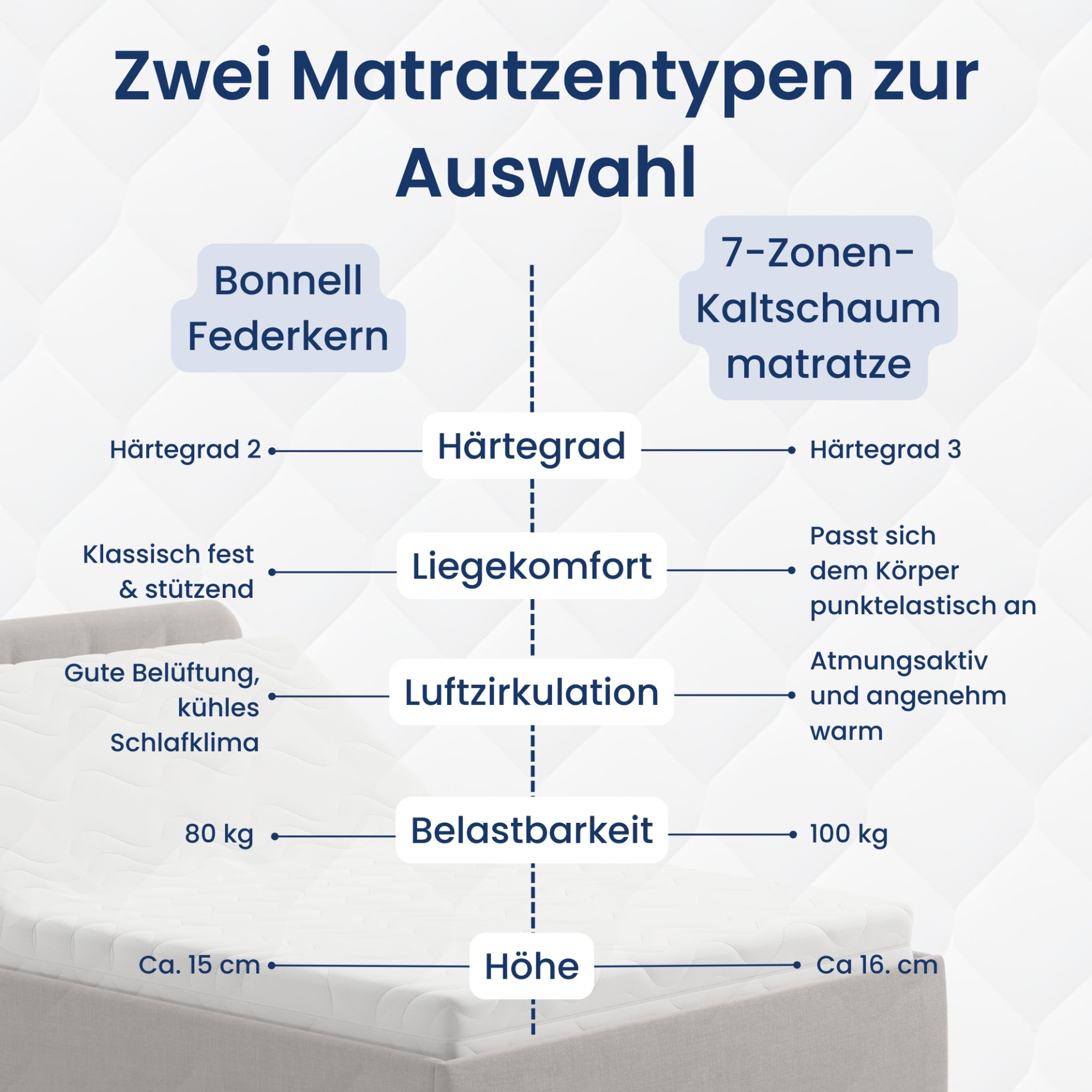 - Bonnell-Federkernmatratze H2 (15 cm) - klassisch fest und stützend, sorgt für eine gute Luftzirkulation und ein kühleres Schlafklima. Belastbar bis 80 kg.