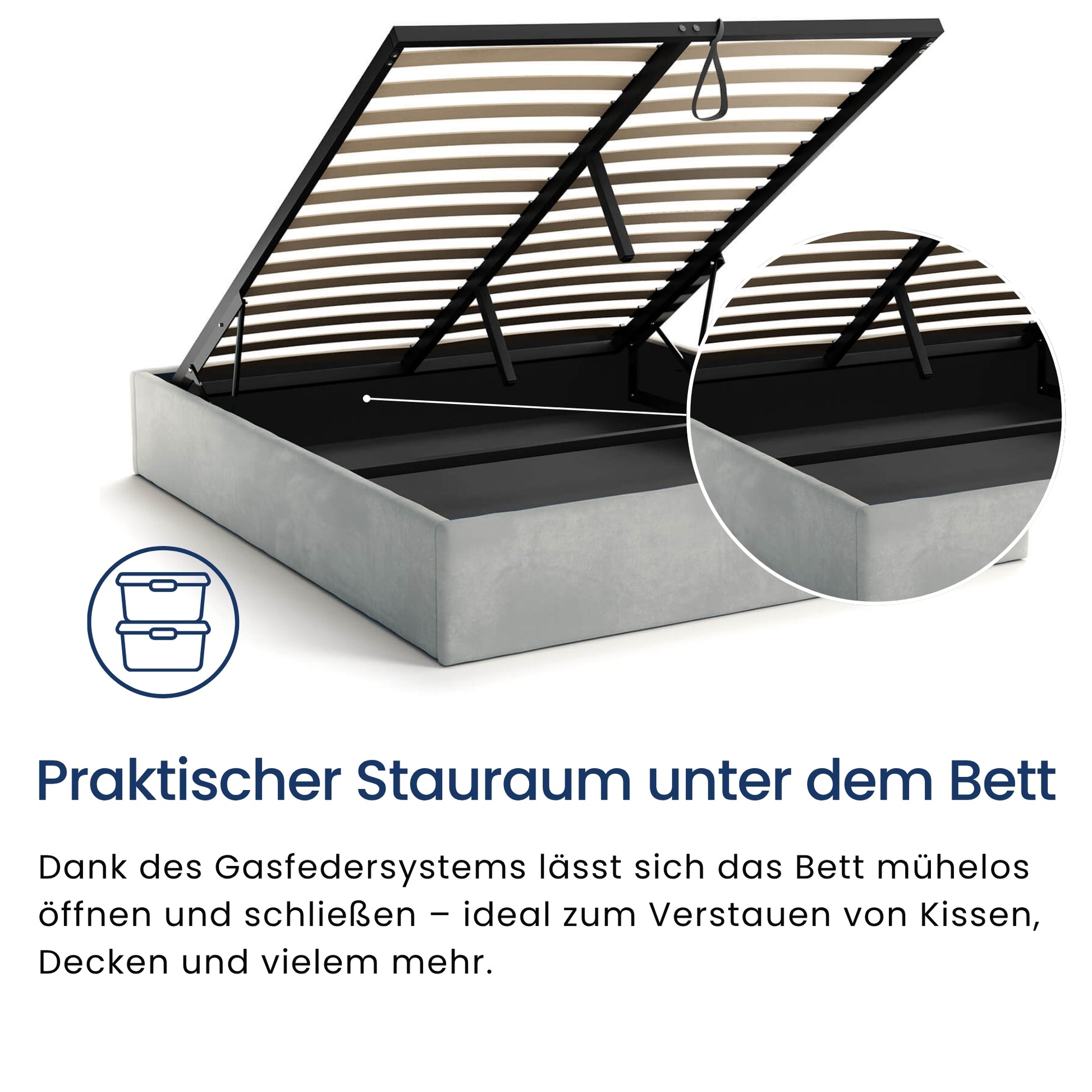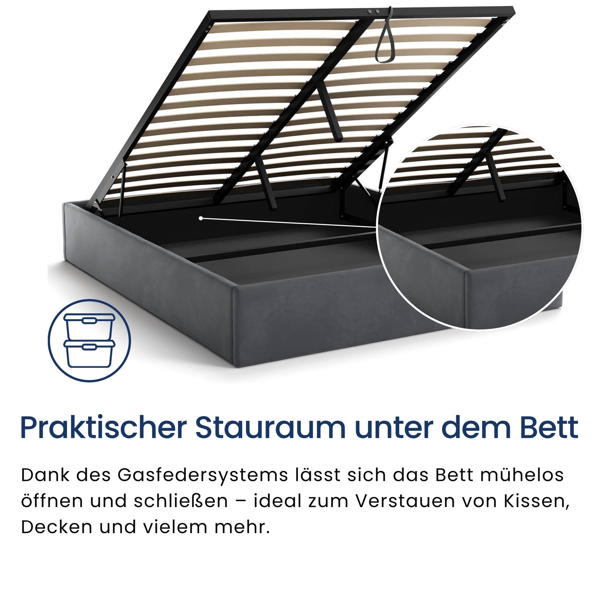 Dieses moderne Polsterbett ohne Kopfteil kombiniert eine platzsparende Form mit praktischen Funktionen. Dank des integrierten Gaslift-Systems ist der großzügige Stauraum unter der Liegefläche jederzeit leicht zugänglich – perfekt für Decken, Kissen oder Kleidung.