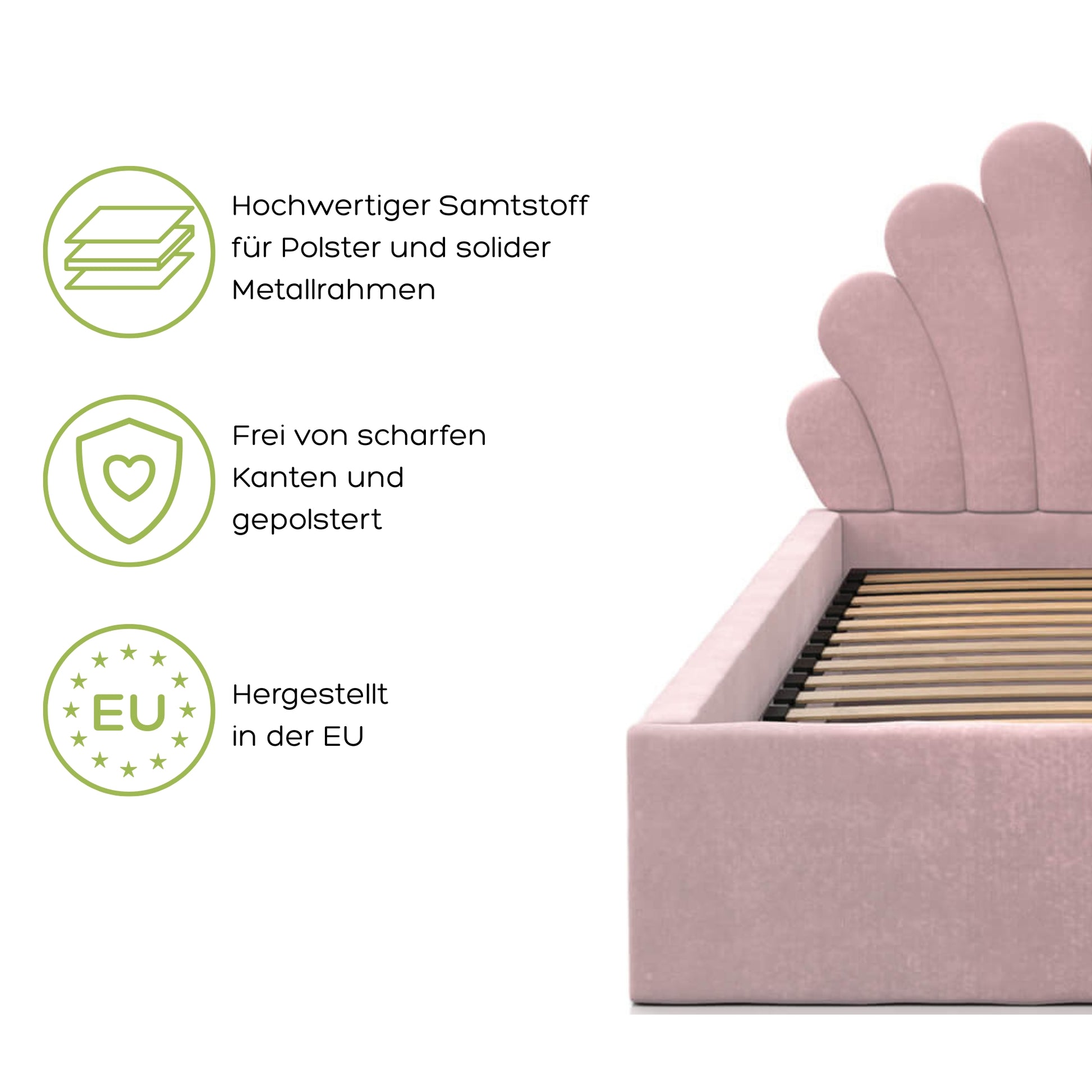 Dieses bezaubernde Kinderbett mit gepolstertem Muschel-Kopfteil vereint märchenhaftes Design mit kindgerechtem Komfort und Sicherheit. Der edle Samtstoff verleiht dem Bett eine elegante Ausstrahlung und sorgt für ein weiches, angenehmes Liegegefühl – perfekt für kleine Prinzessinnen und liebevoll gestaltete Kinderzimmer.