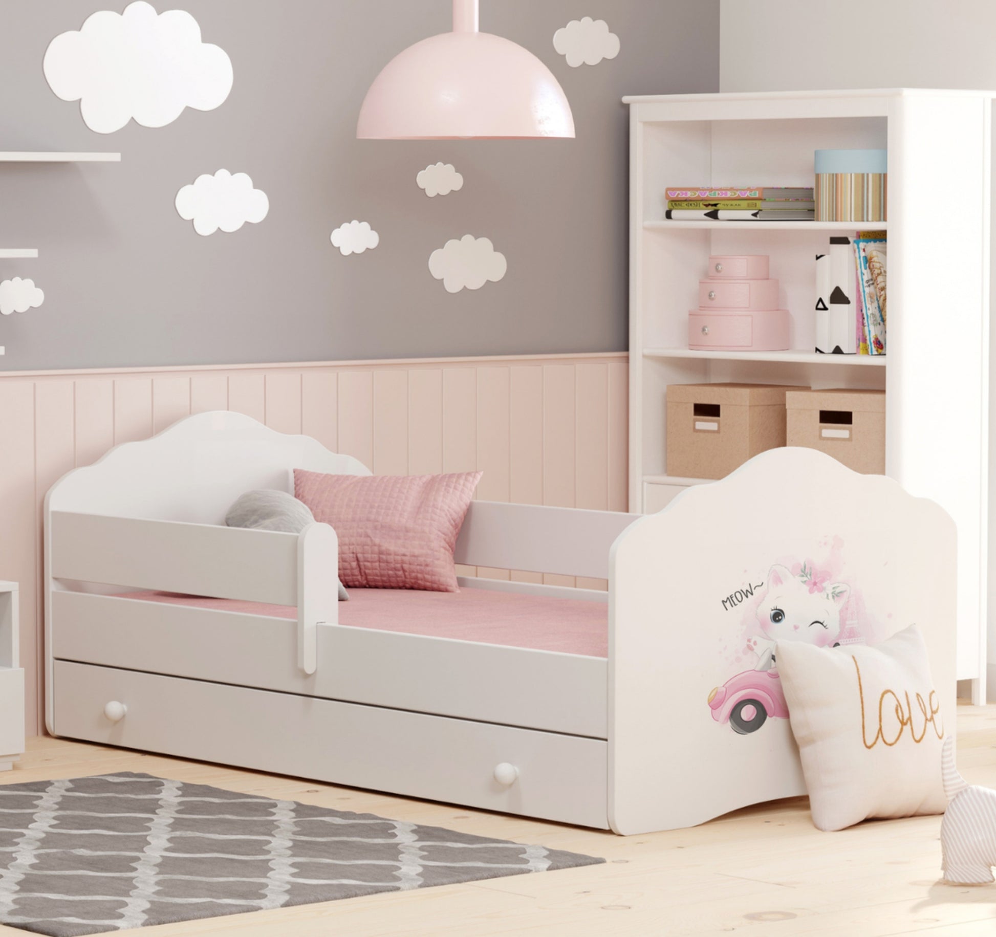 Dieses Kinderbett mit Geländer und Schublade vereint hohe Qualität, Komfort und ansprechendes Design und sorgt für einen sicheren und erholsamen Schlaf Ihres Kindes.