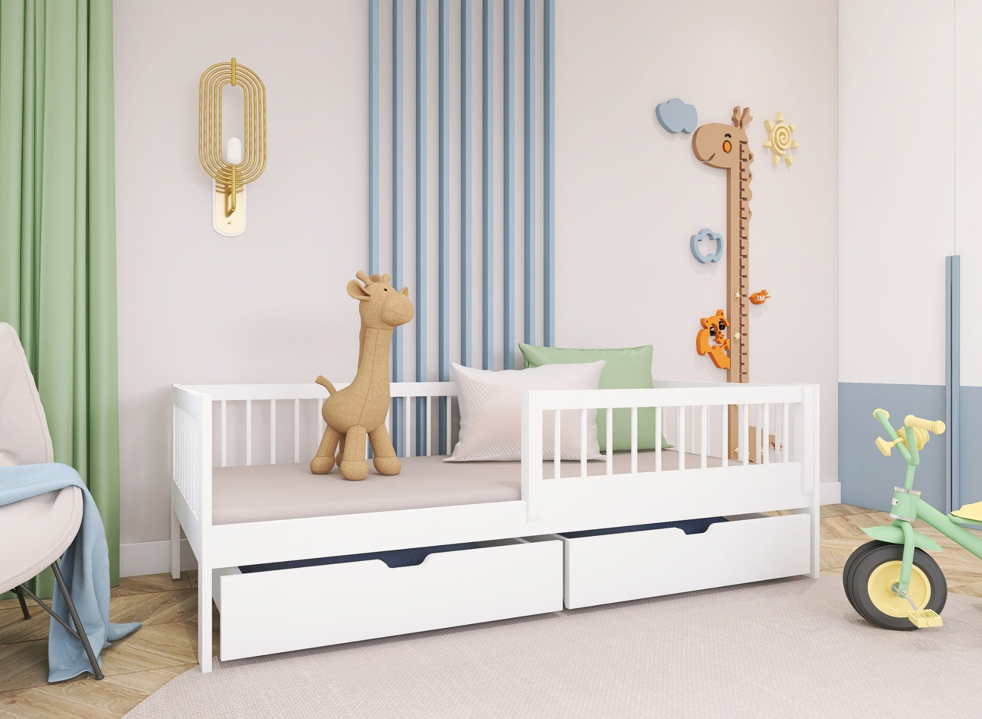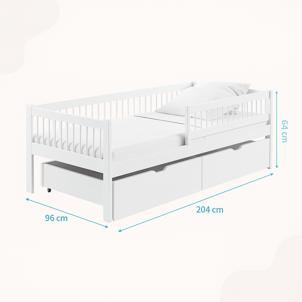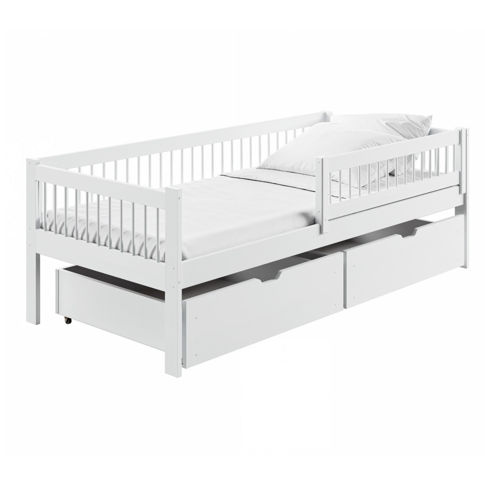 Kinderbett 90x200 cm mit zwei Schubladen, Rausfallschutz und Lattenrost Gitterbett Kinder Jugendbett | Kiefer-Massivholz | 90x200 cm: von 4. bis 18. Lebensjahr, Weiß