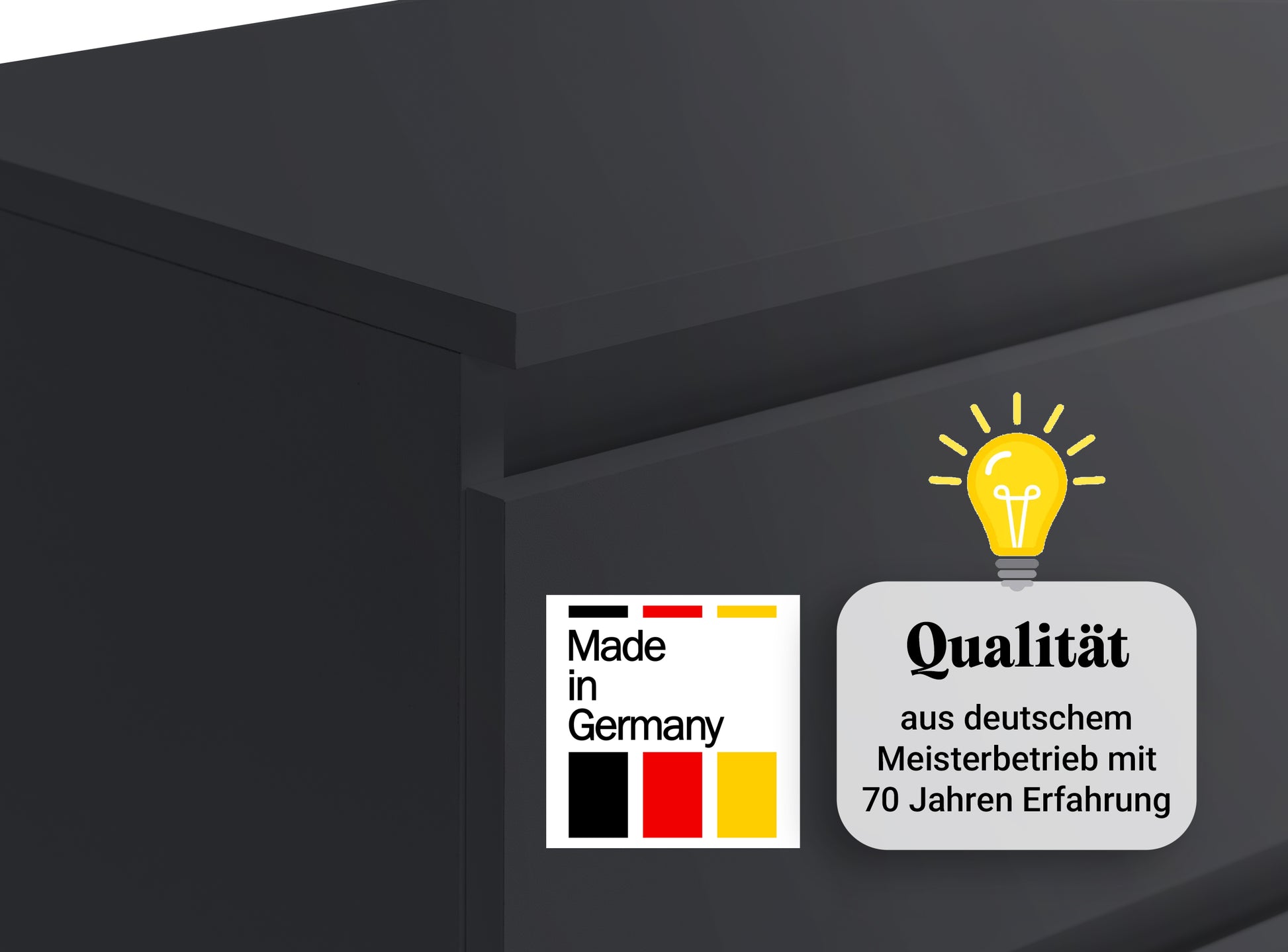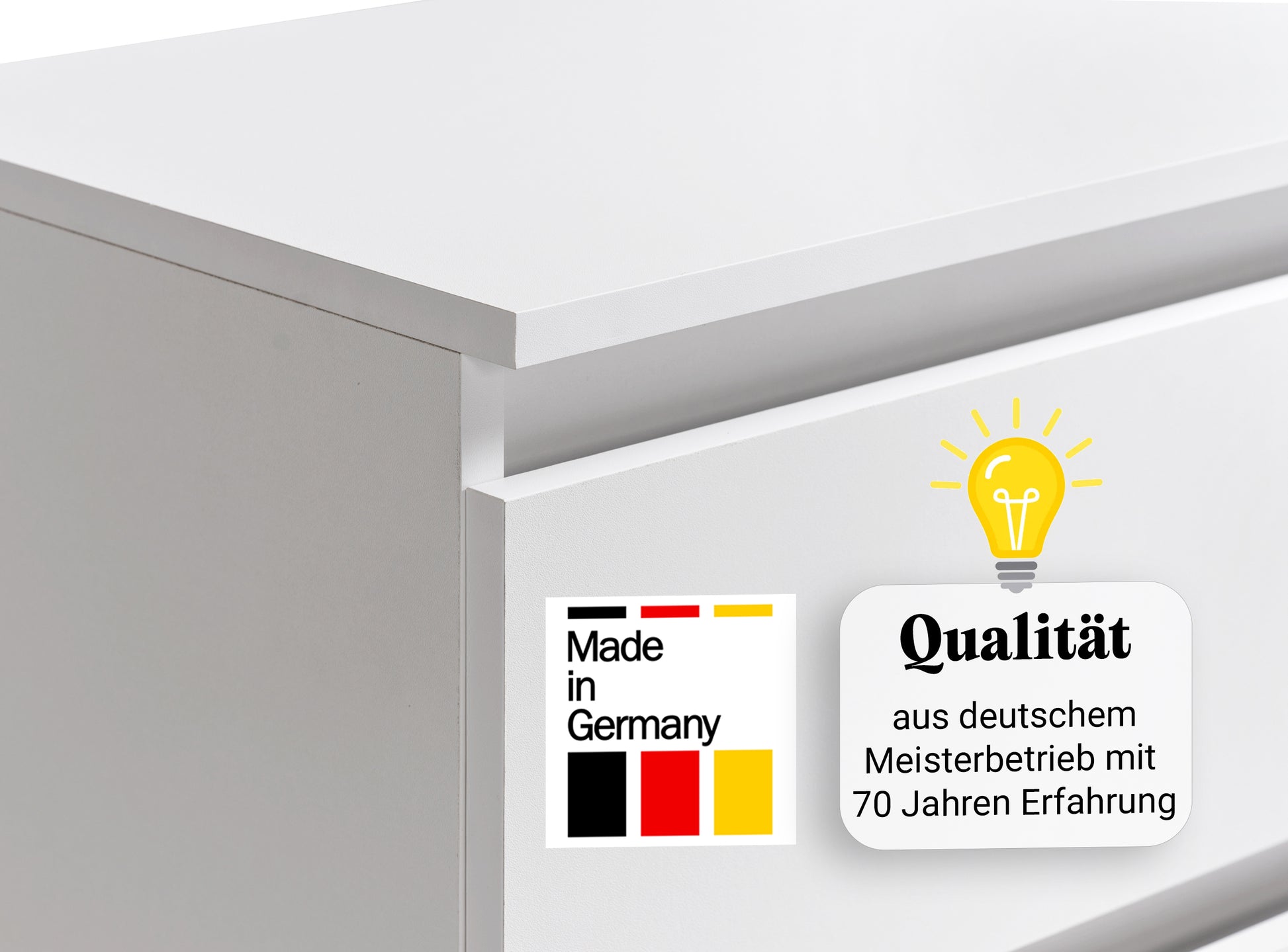 Die Kombination aus zeitlosem Design und praktischen Funktionen macht diese Kommode zu einem echten Allrounder. Egal ob im Schlafzimmer, Flur, Kinderzimmer oder Wohnzimmer – diese Kommode passt einfach überall hin. Ihre robuste Konstruktion sorgt dafür, dass die Schubladen stabil laufen und nicht klappern, was durch den hochwertigen Kugelauszug gewährleistet wird. Darüber hinaus wird dieses Möbelstück in einem deutschen Meisterbetrieb mit über 70 Jahren Erfahrung gefertigt, was für eine besonders hohe Qualität und Langlebigkeit spricht.
