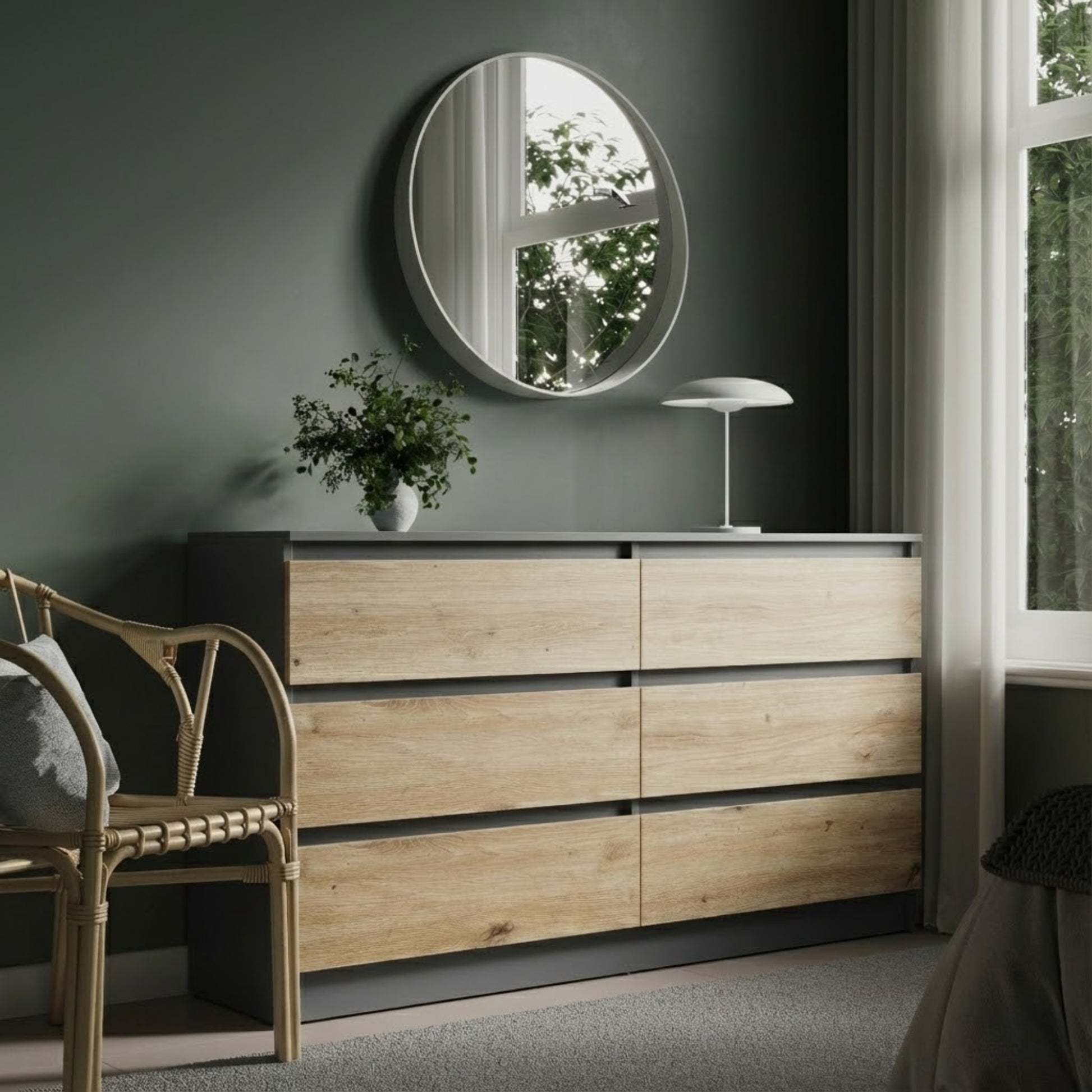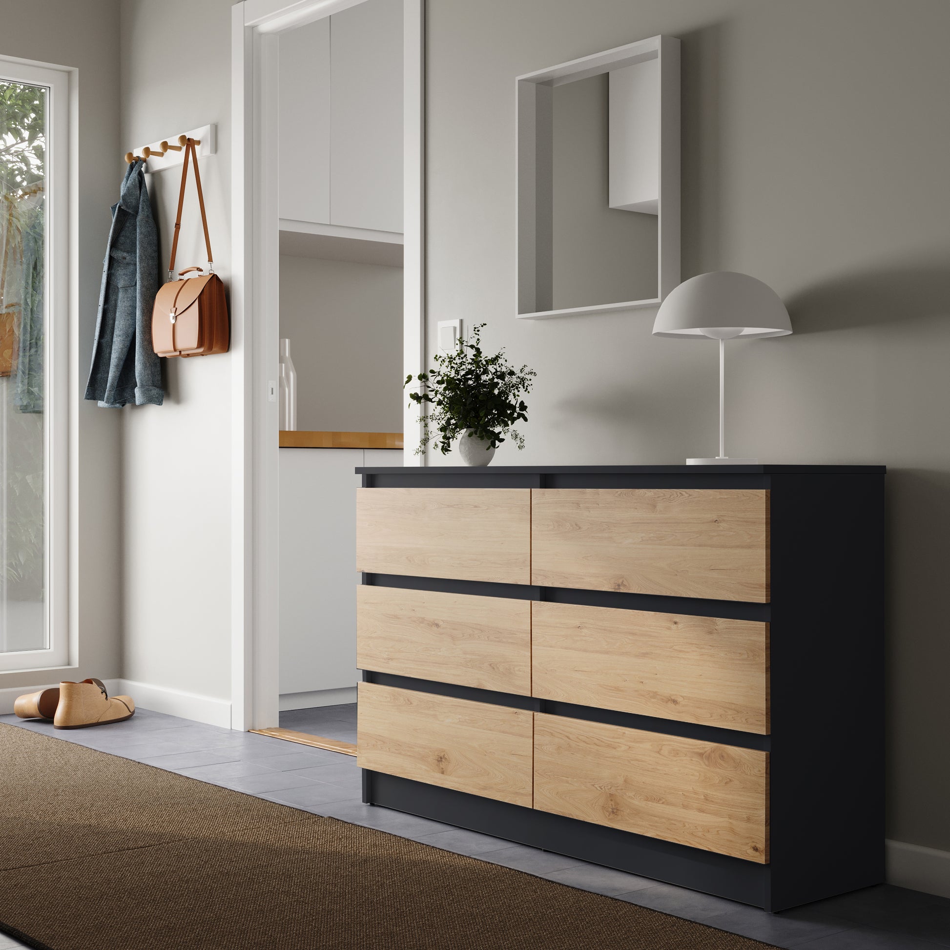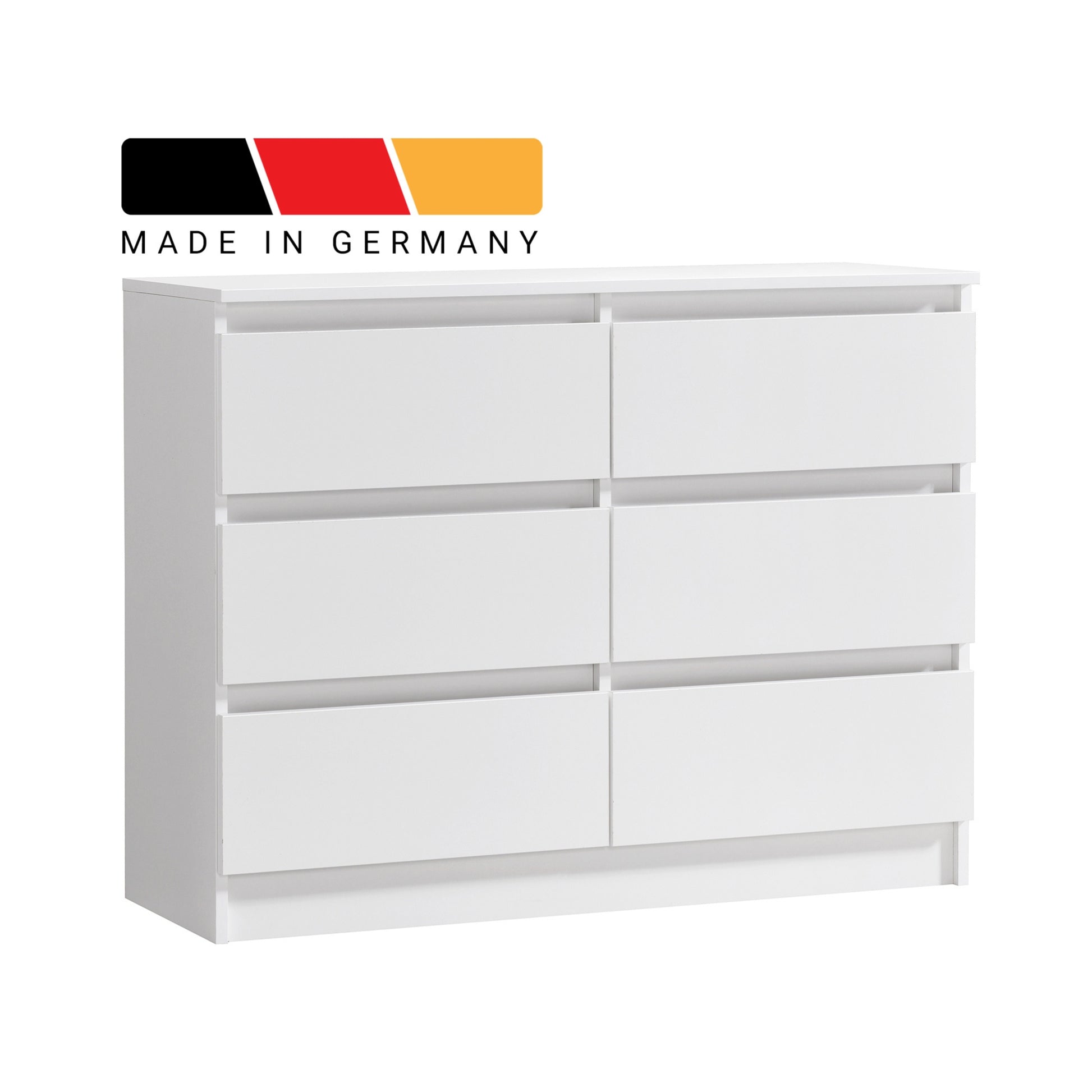 Unsere funktionale Kommode ist die perfekte Ergänzung für jeden Raum. Sie bietet großzügigen Stauraum in ihren sechs geräumigen Schubladen, die in zwei Reihen angeordnet sind und sich über die gesamte Breite der Kommode erstrecken. Zusätzlich bietet die glatte Oberfläche der Kommode Platz für Dekorationen oder praktische Gegenstände des täglichen Gebrauchs. Dank des grifflosen Designs wirkt die Kommode besonders modern und minimalistisch, wodurch sie sich ideal in ein skandinavisch inspiriertes Interieur einfügt.