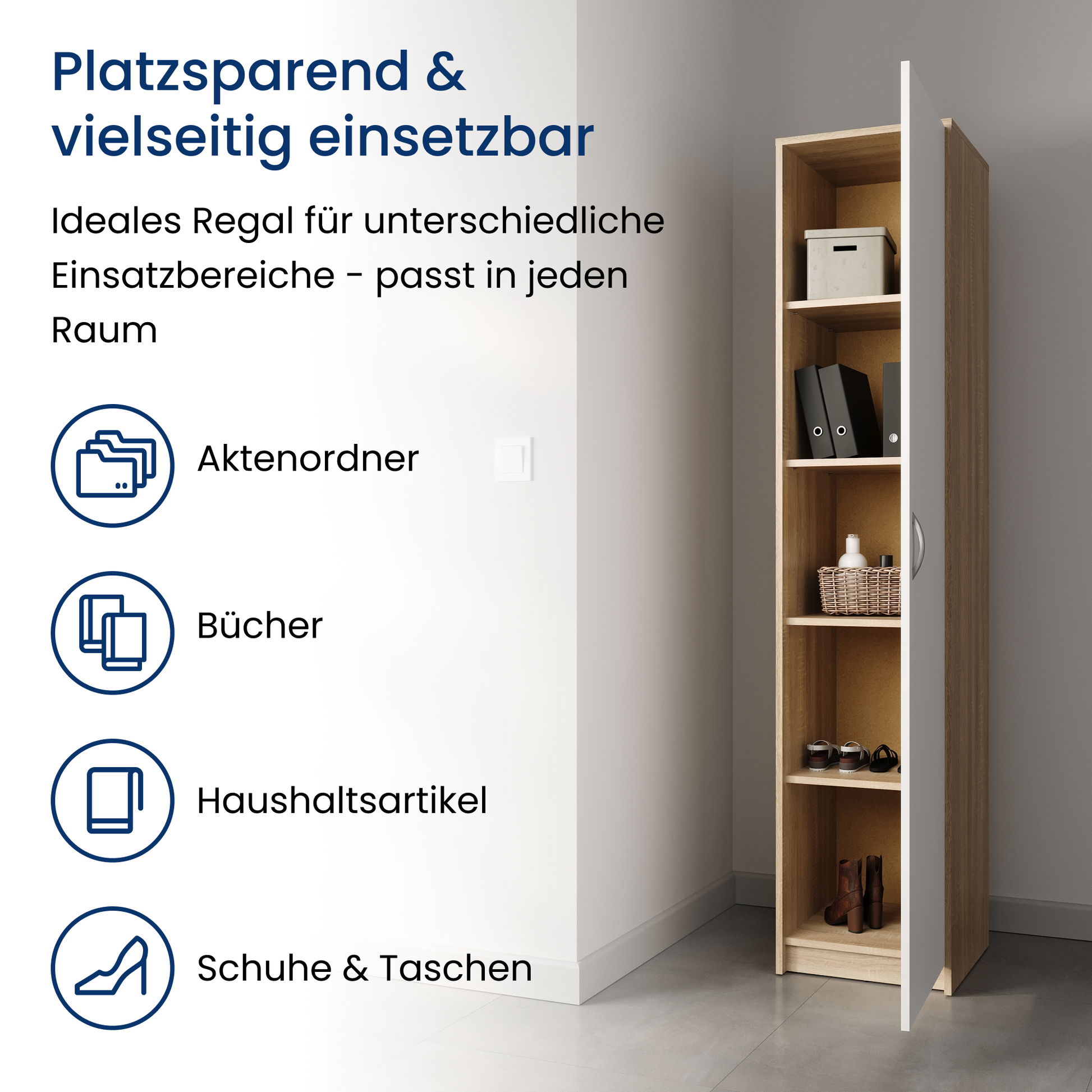 Regal mit 5 Ebenen in mattem Finish Aktenschrank mit 4 Einlegeböden und 1 Tür, Standregal 39 cm breit mit hochwertigen Polymergriffen ideal für Schlafzimmer, Wohnzimmer, Flur, Büro